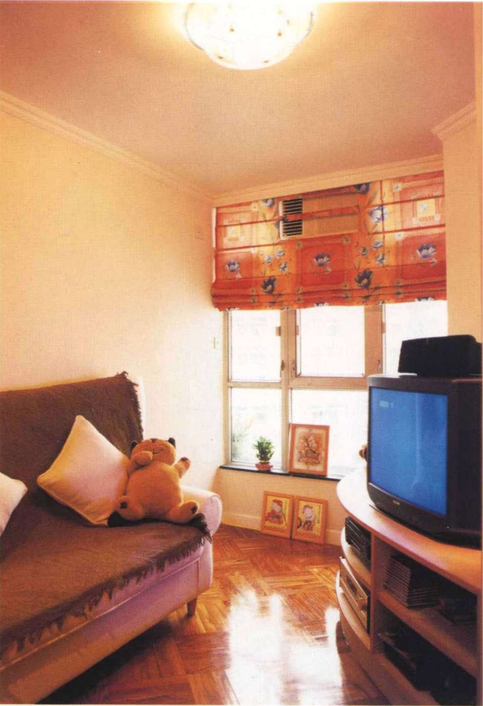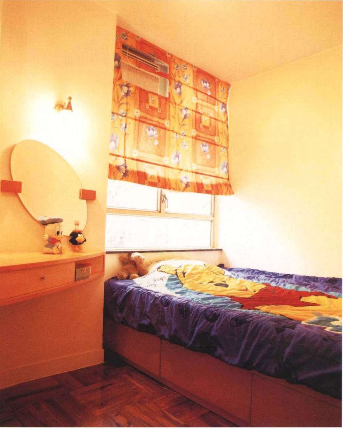 主人睡房内安装着鲜橙色碎花罗马布帘及弧形的梳妆台,与客厅的陈设风格贯彻始终,也同时缔造一室清新简洁的布局。