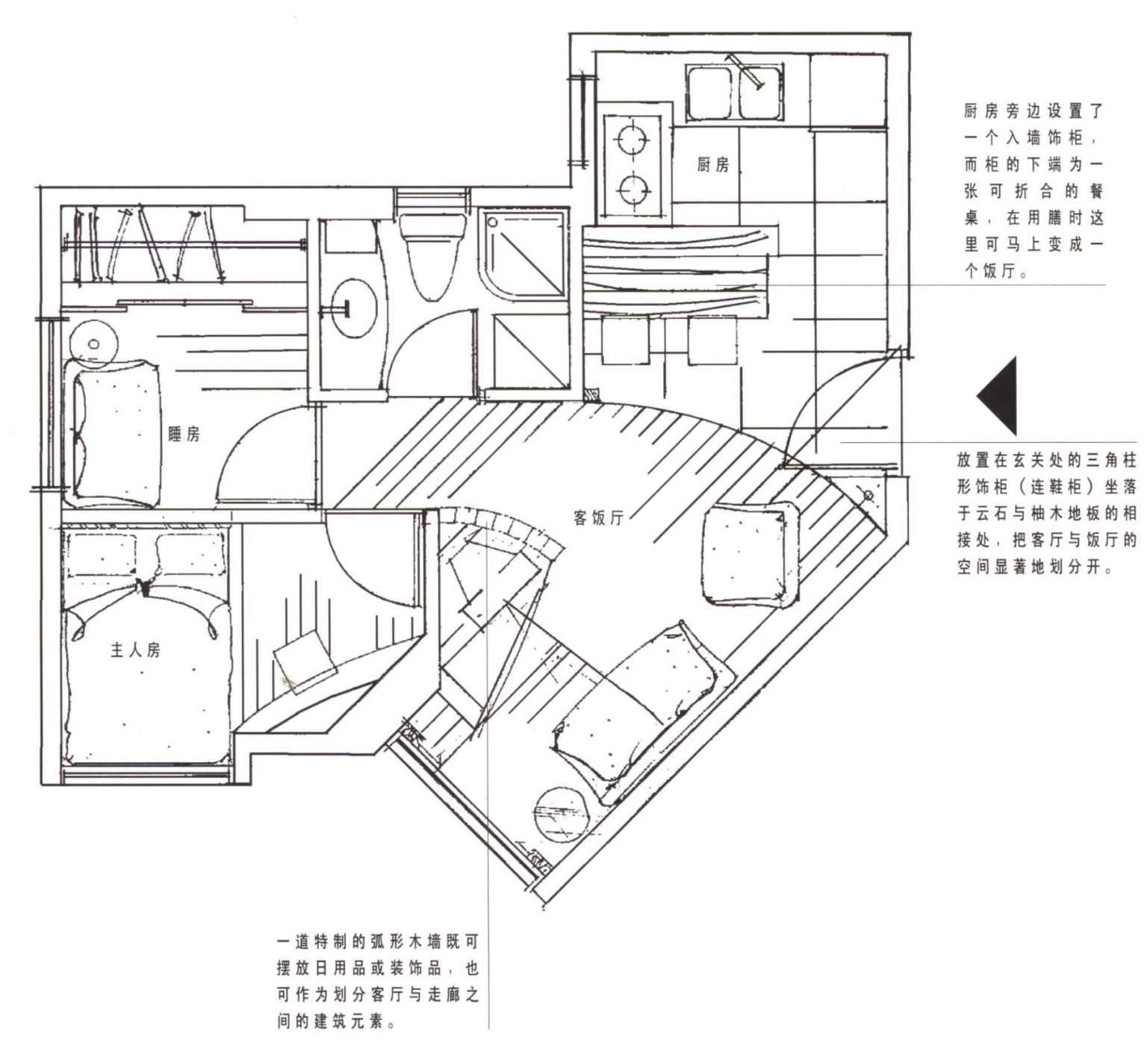 由于本居室为钻石型单元,设计师在安排家具、陈设及布局上显然要花更多心思。如何令不规则形状的客厅变得宽敞实用?一件呈弧线形的电视柜改变了原来不规则空间:柜子犹如一轮弯月靠在呈45度角的墙上,为客厅腾出了更多空间,更与柜旁一道特制的弧型木墙互相配合,构造出一个极富动感的流线型厅堂。其实,家居的布局与服装配衬均有着相同的基本原则——如一个人要穿上适合自己身份的服饰。那么,他身上每一件衣服的色调及款式均必须配搭得宜。同样地,要塑造出一个富特色的空间,并不能单纯依靠单一的建筑元素或家具,最重要的是把各种元素互相融合。才能把客厅改造成一个更宽敞、更具美感的空间。