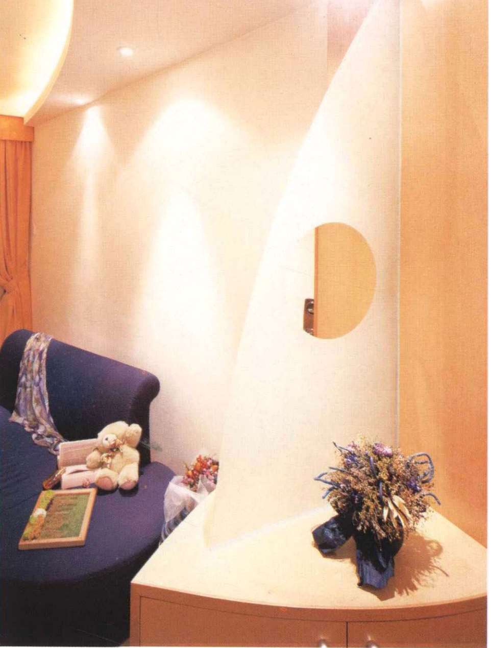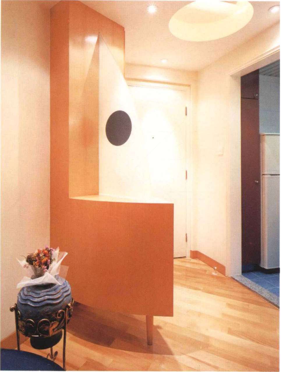 玄关位置的鞋柜特意造成风帆玄关位置的鞋柜特意造成风帆状,除了取其外形独特、富新意外,利用弧形线条改变厅堂的形状也是其中目的之一。