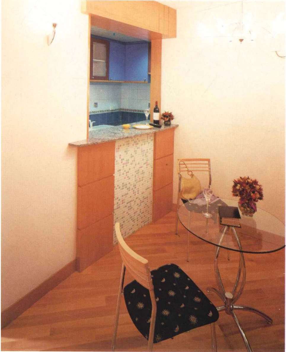 原来密封的厨房拆改为半开放式,小型云石超出本位,墙身除榉木外还夹杂彩色纸皮石,是鲜见的设计素材。厨房门拆去了,不致占去太多的空间。