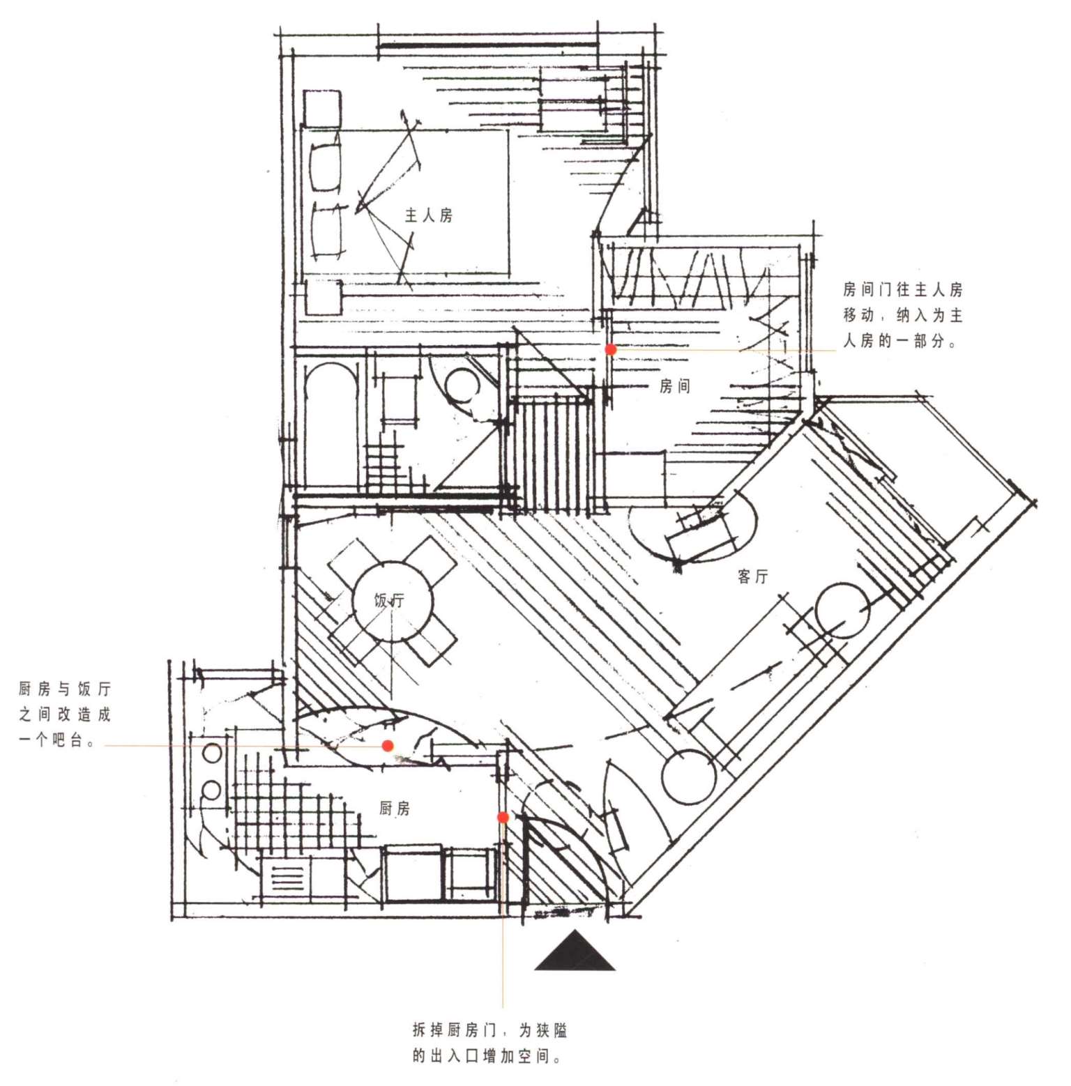 原来房子有不少拆改的地方,一来是拆去若干间隔墙壁及房门,让一个人住的空间更见宽敞;二来是改动一些家具摆放的位置,为不规则的厅堂重造新的起居模式。