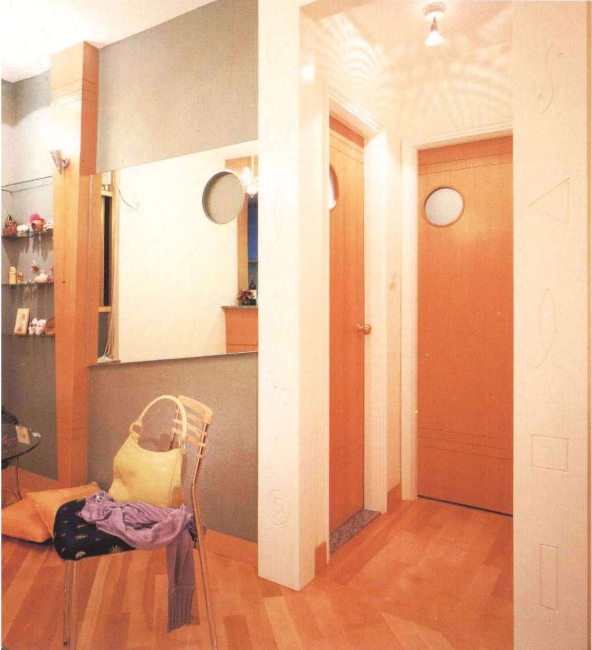 鞋柜上风帆状磨砂玻璃中的圆形是一面镜子,让屋主临出门前可以再一整姿容。