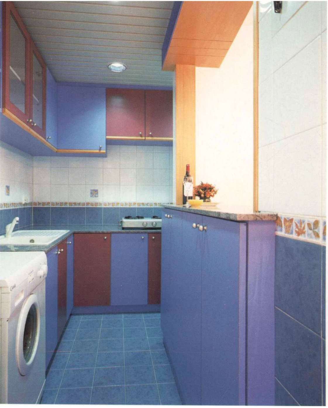 蓝色的地砖、蓝白色的墙砖、蓝红色的厨柜,将厨房变成蓝色的天地,的确有人喜欢蓝。