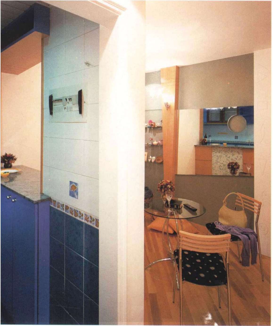 半开放式的厨房以榉木及彩色纸皮石拼半开放式的厨房以榉木及彩色纸皮石拼砌出独特的效果,如设计师所说,用料较为新鲜,能带出令人意外的惊喜。