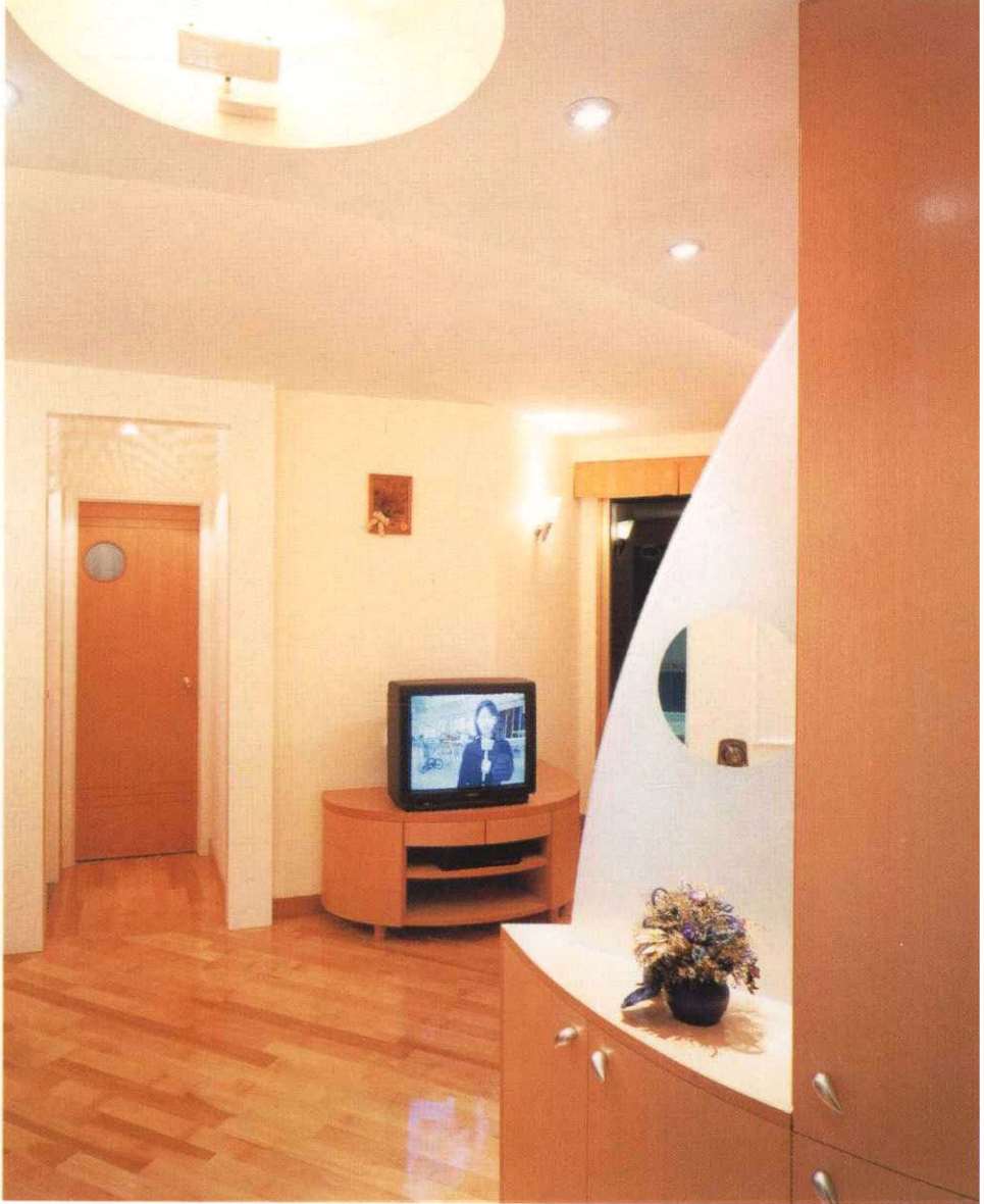 由玄关延伸至客厅的弧形假天由玄关延伸至客厅的弧形假天花板内置光源,射灯和反射灯互相配合。