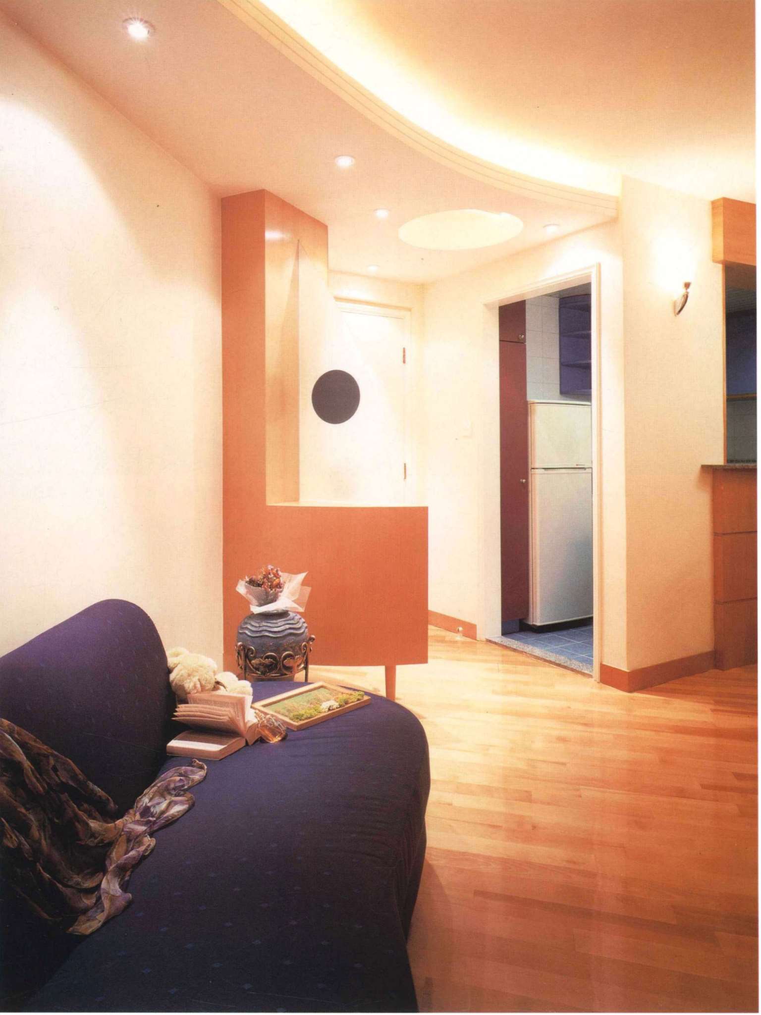原来的厅堂是呈不规则状的,若在贴近露台的长方形空间里同时摆放沙发及电视柜,则两者的距离太近了,不太方便。如要拉远两者间的距离,便要挪出一点。设计师借用了客厅近睡房走廊处的转角位造了一个弧形电视柜,相对的位置则摆放了一张沙发。这样,电视柜与沙发既是客厅中最远的一段距离,又可以大致保持直线的视点。这是利用家具位置与形状重造生活模式的方法,效果更见理想。