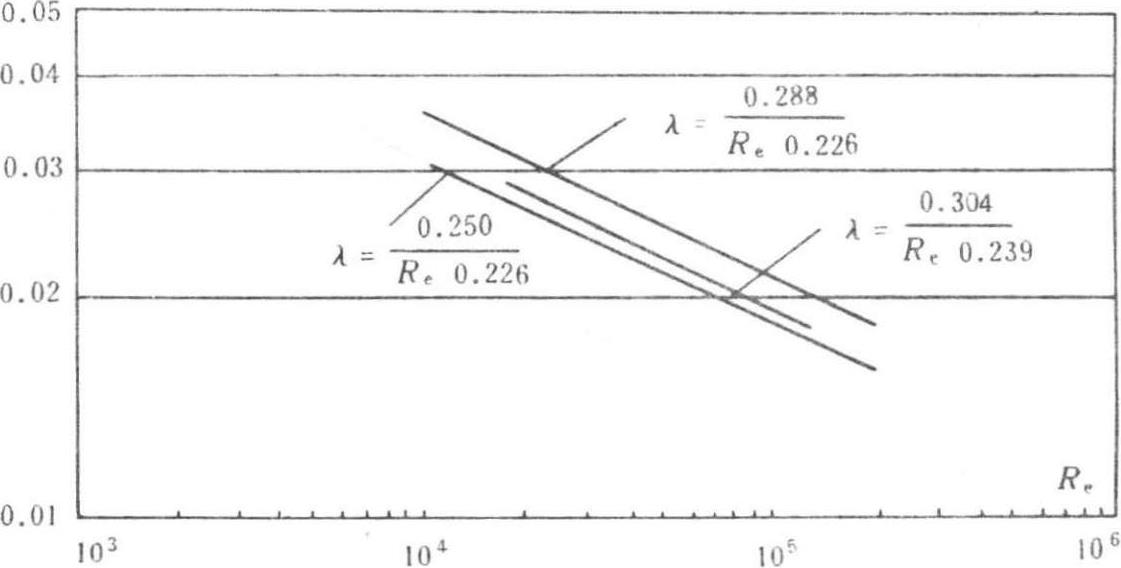 图中另两条曲线分别是苏联舍维列夫公式λ= 0.288/Re 0.226 和苏联水力地质研究所公式 λ = 0.25/Re 0.226 。