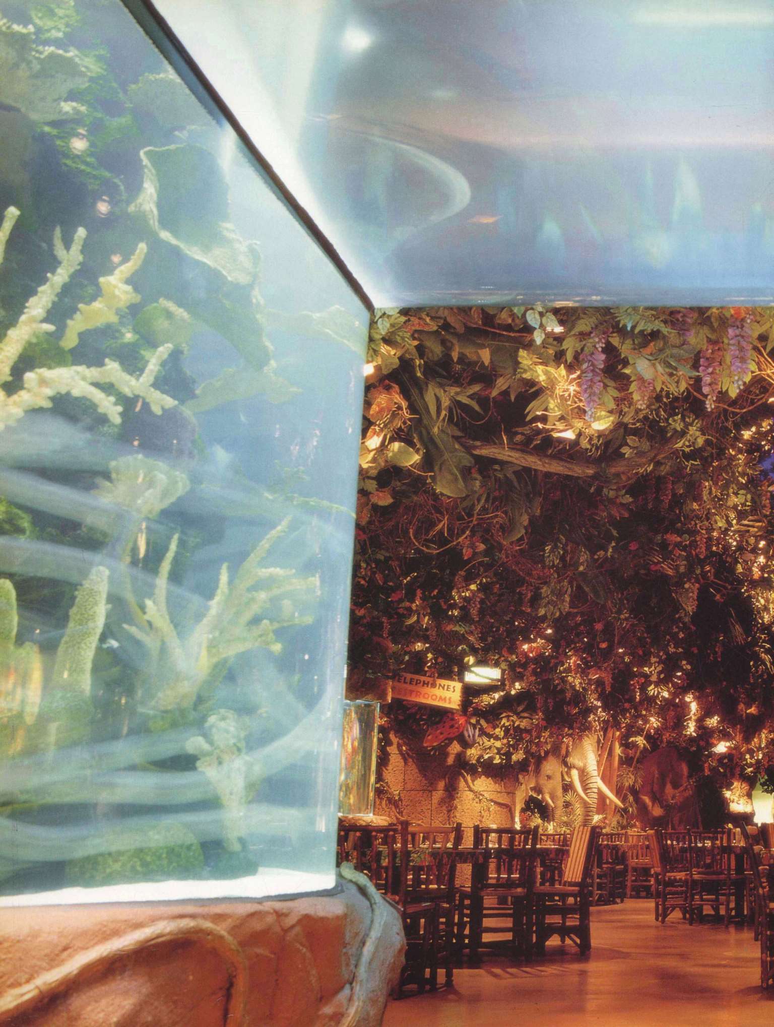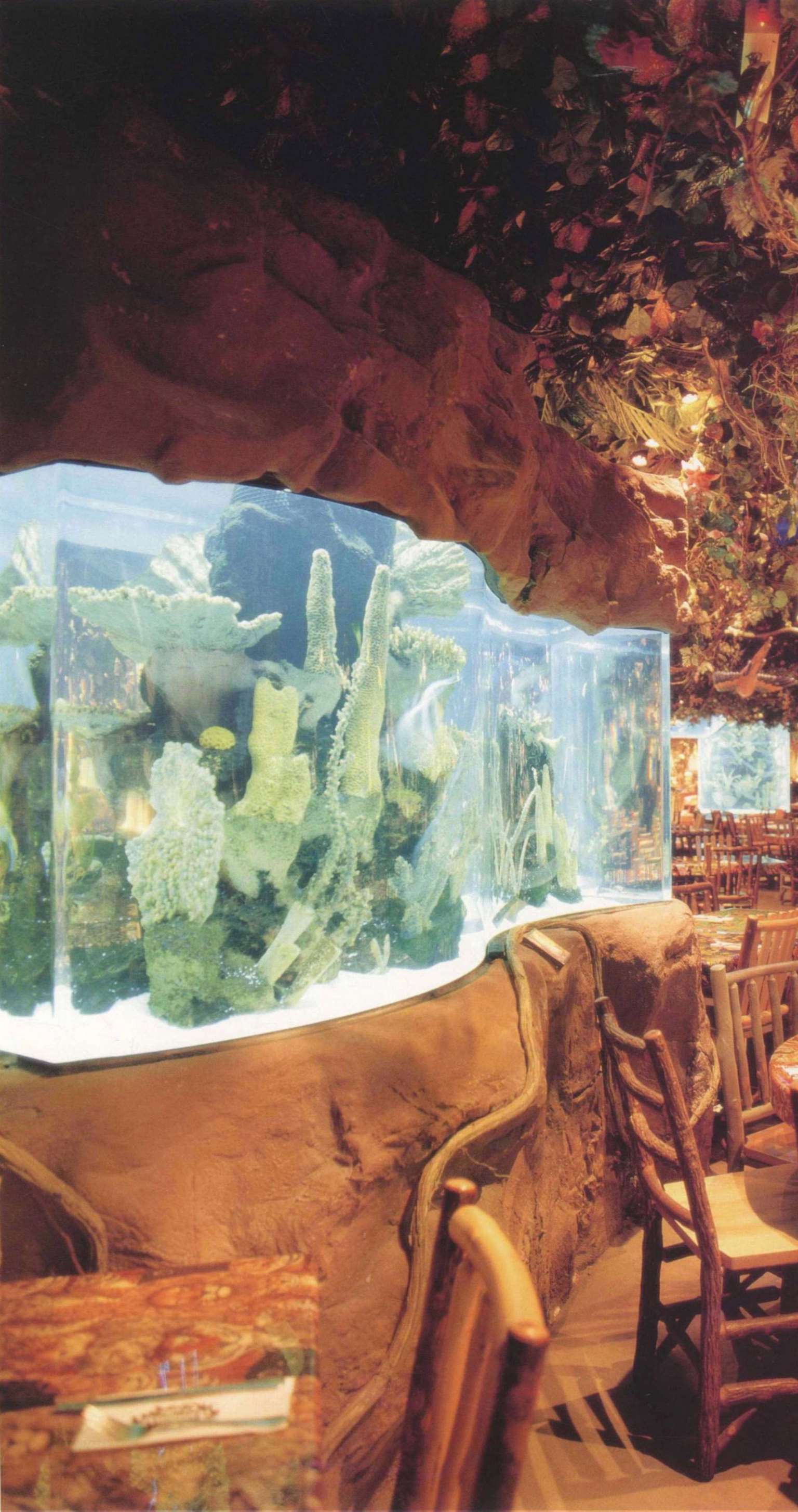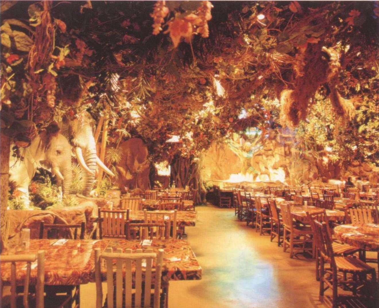 餐厅可容纳360个座位,置身餐厅里,四周是刺激感官的特别效果:层层叠叠的瀑布,渗出透心凉的雾气,热带暴雨,雷电交加的场面遍,地是大朵的蘑菇,其上有出神入化的动画如,能言树翠丝,每隔30秒就会跟大家分享她的趣事和环保讯息,全部都围绕着老大的榕树出现融汇入热带雨林的声色里