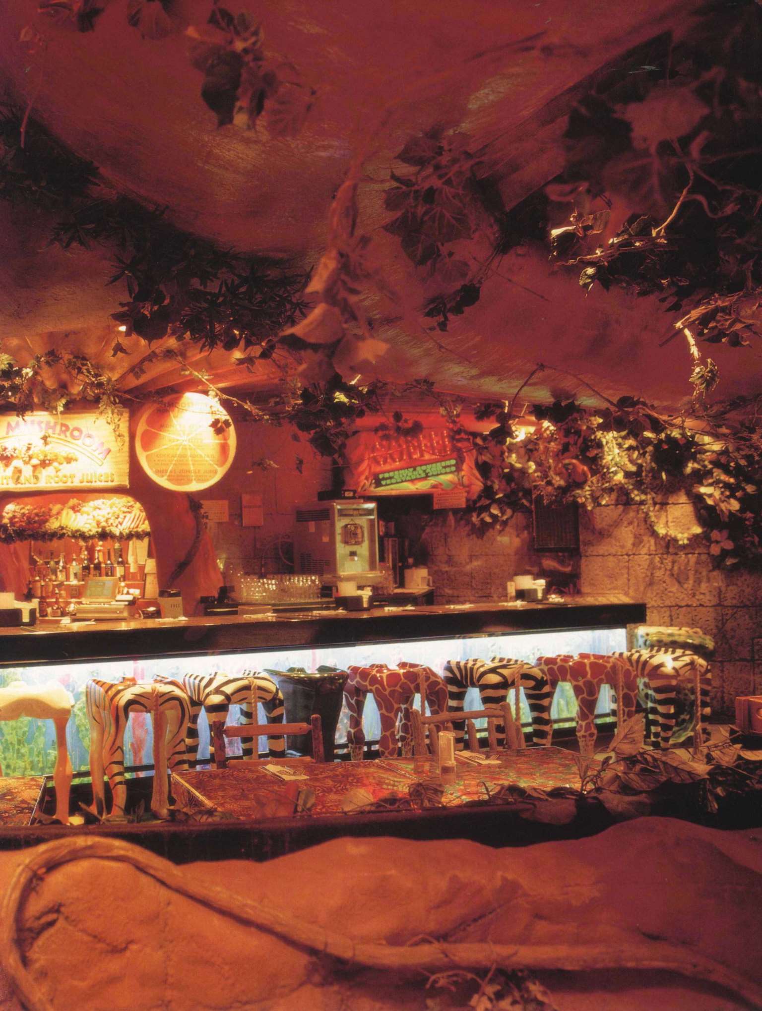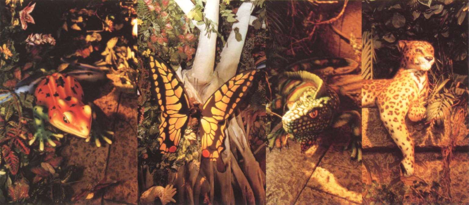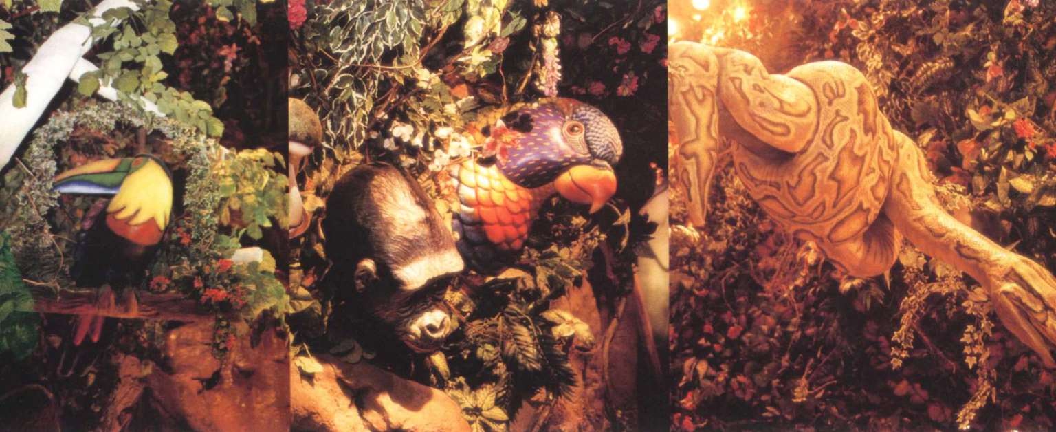餐厅可容纳360个座位,置身餐厅里,四周是刺激感官的特别效果:层层叠叠的瀑布,渗出透心凉的雾气,热带暴雨,雷电交加的场面遍,地是大朵的蘑菇,其上有出神入化的动画如,能言树翠丝,每隔30秒就会跟大家分享她的趣事和环保讯息,全部都围绕着老大的榕树出现融汇入热带雨林的声色里