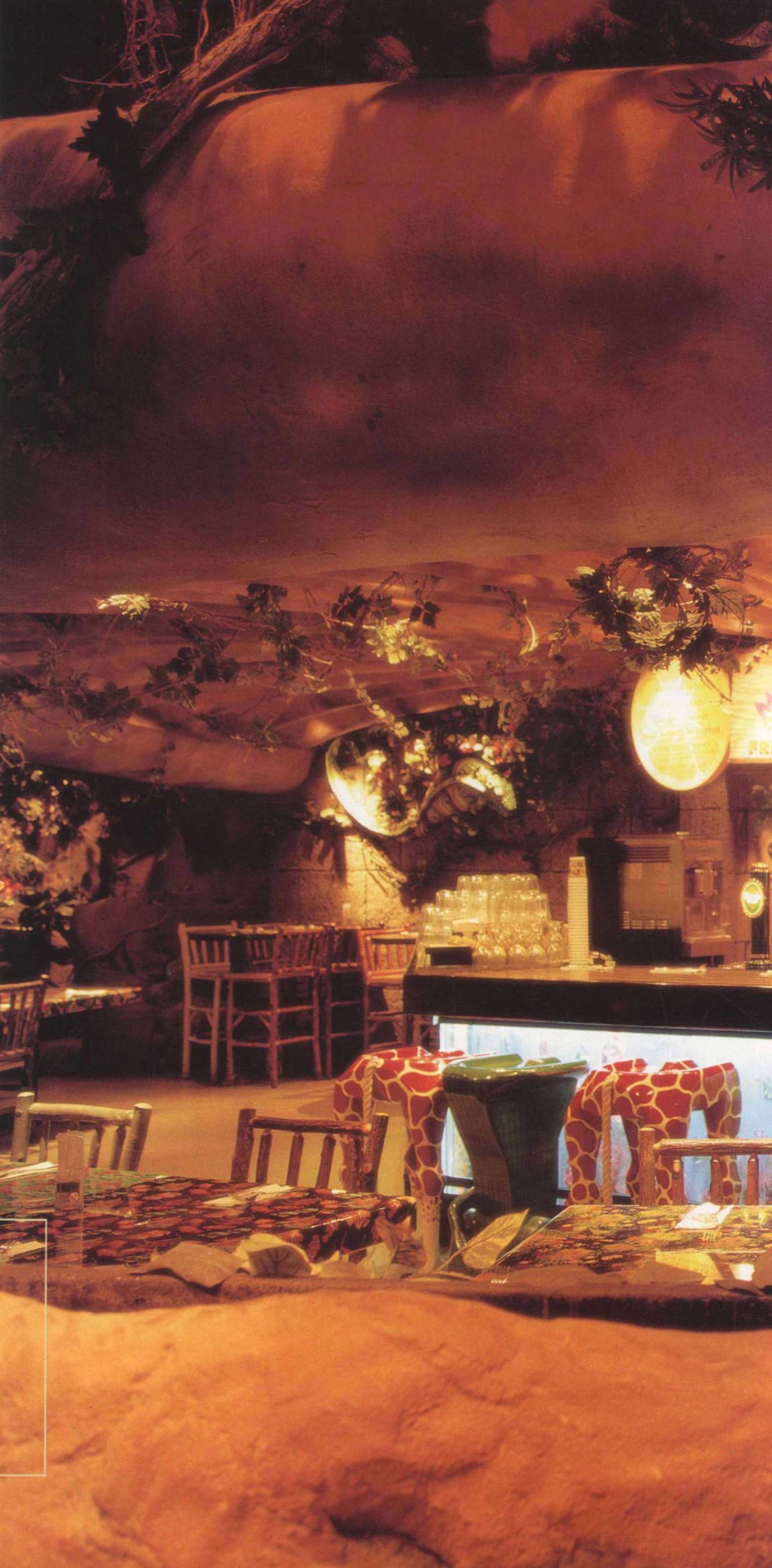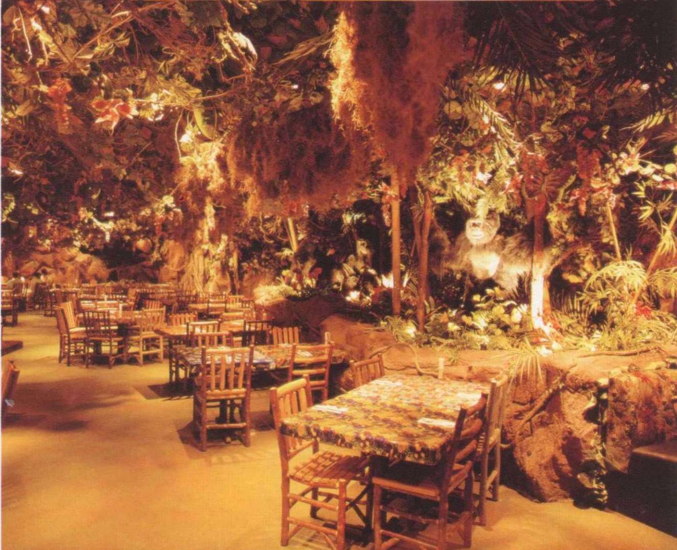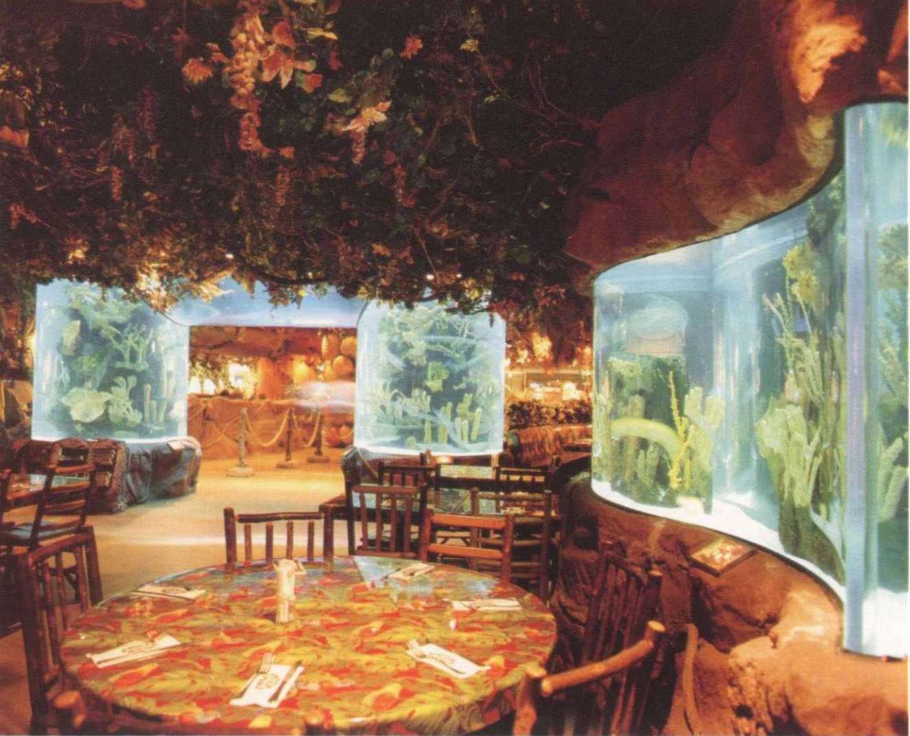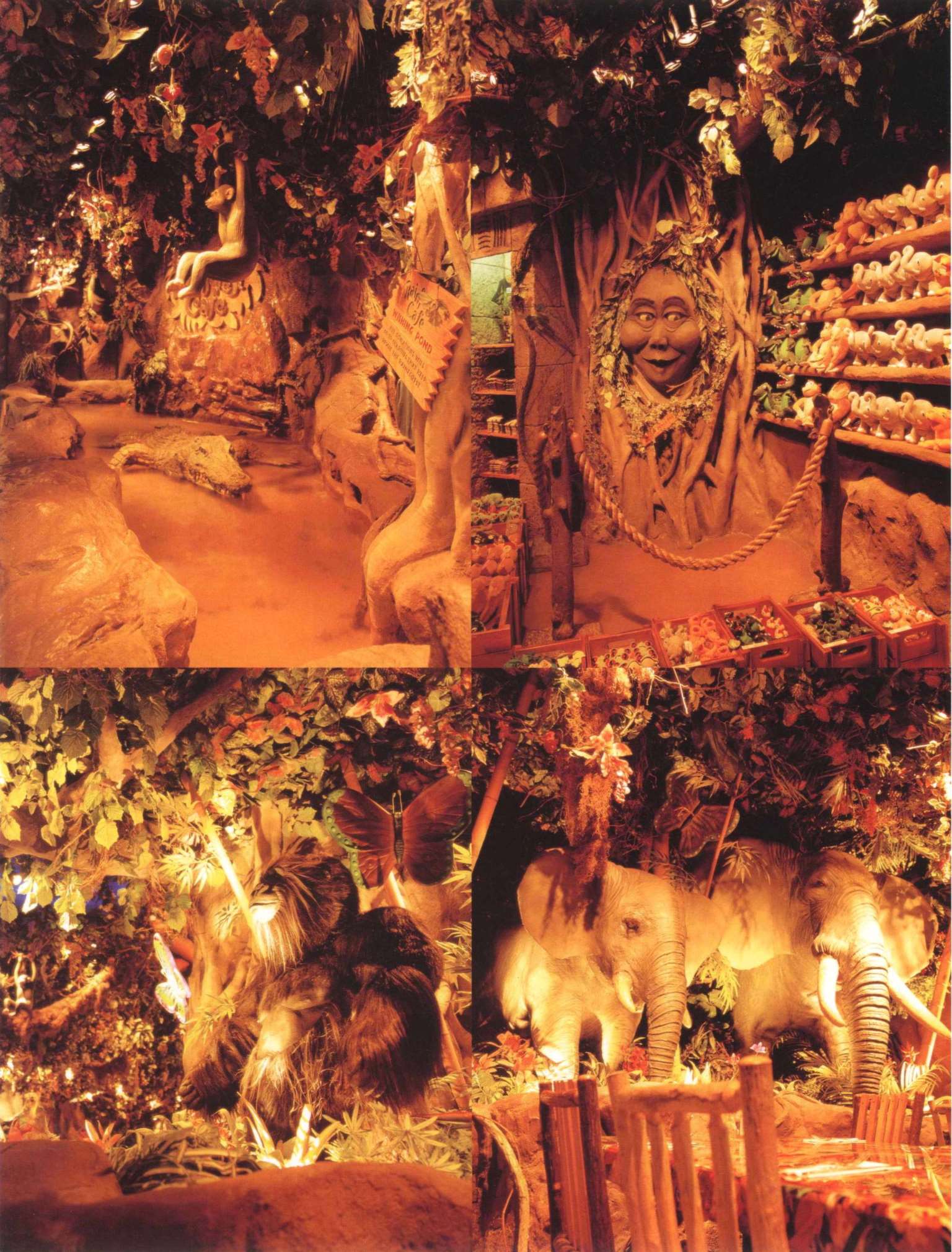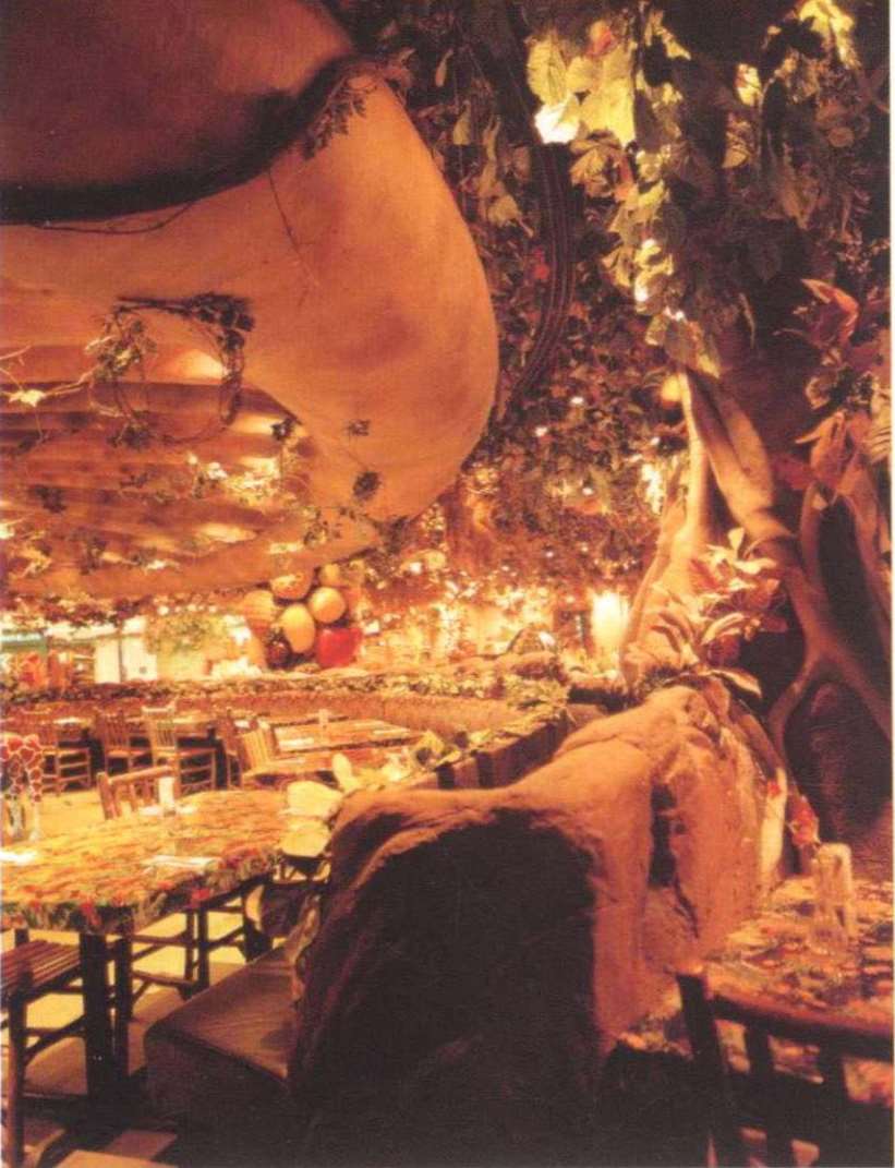 餐厅可容纳360个座位,置身餐厅里,四周是刺激感官的特别效果:层层叠叠的瀑布,渗出透心凉的雾气,热带暴雨,雷电交加的场面遍,地是大朵的蘑菇,其上有出神入化的动画如,能言树翠丝,每隔30秒就会跟大家分享她的趣事和环保讯息,全部都围绕着老大的榕树出现融汇入热带雨林的声色里