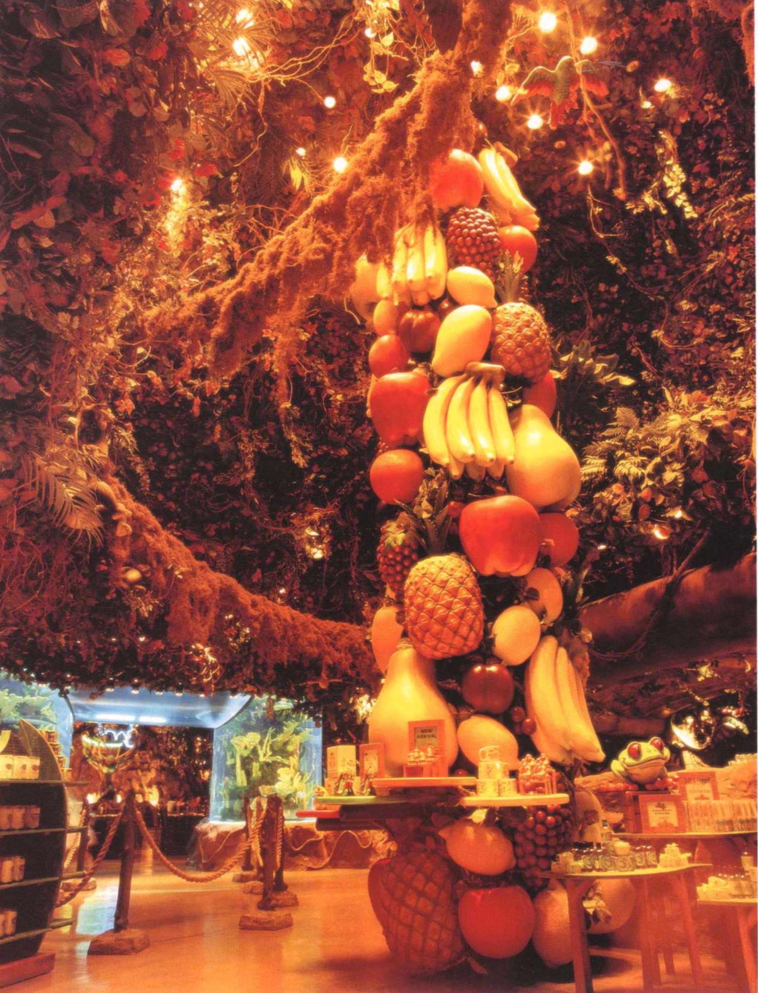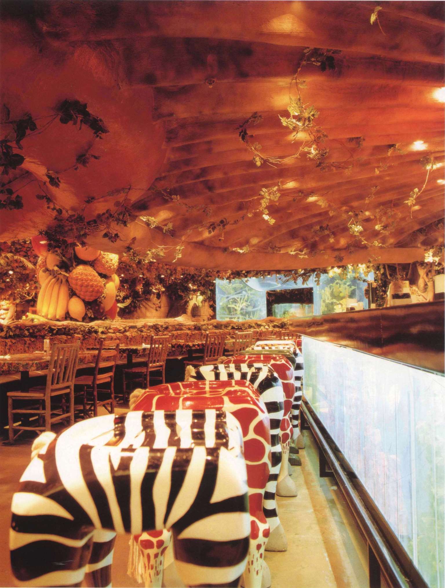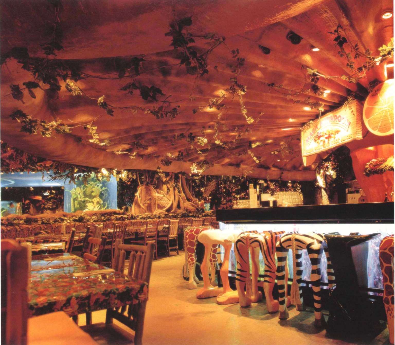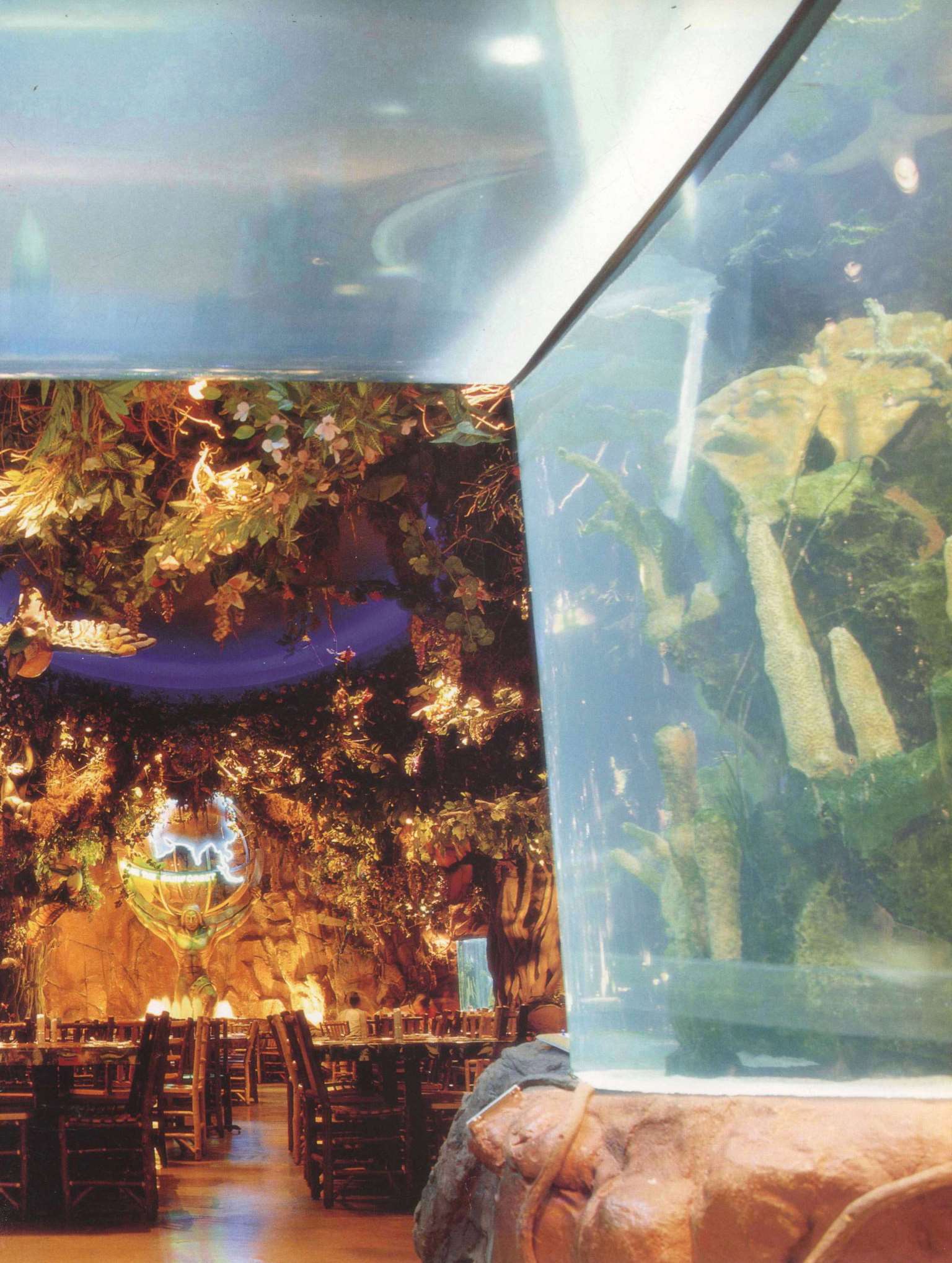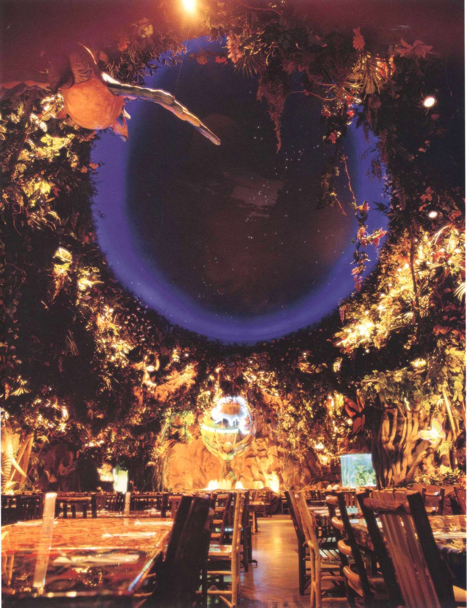餐厅可容纳360个座位,置身餐厅里,四周是刺激感官的特别效果:层层叠叠的瀑布,渗出透心凉的雾气,热带暴雨,雷电交加的场面遍,地是大朵的蘑菇,其上有出神入化的动画如,能言树翠丝,每隔30秒就会跟大家分享她的趣事和环保讯息,全部都围绕着老大的榕树出现融汇入热带雨林的声色里