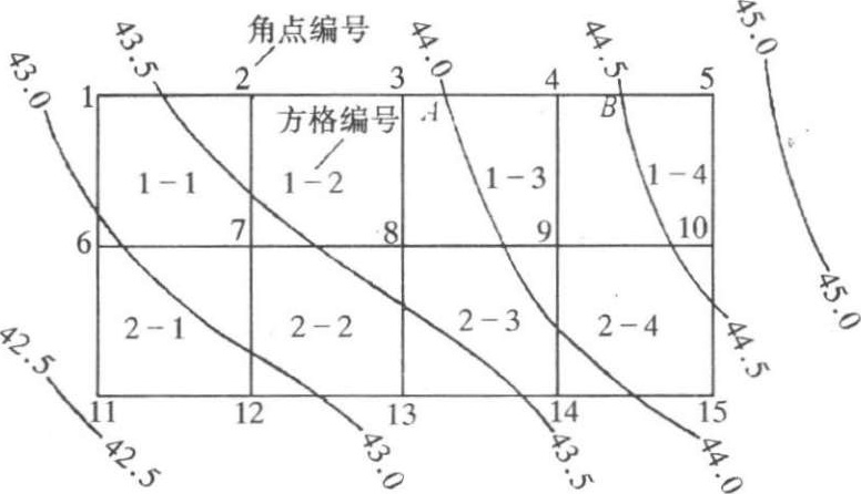 如图1-2-1 ( a )所示,将地形图上场地的范围划分为若干方格。每个方格的角点标高,可根据地形图上该角点相邻两等高线的标高,用插入法求得。在无地形图的情况下,可在地面用木桩打好方格网,然后用仪器直接测出各角点标高。