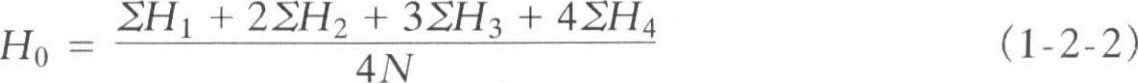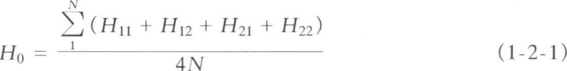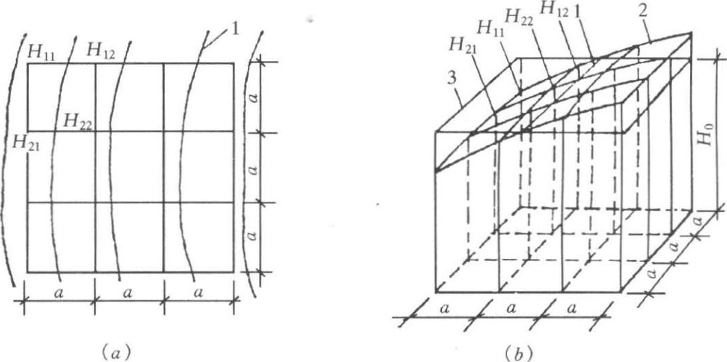 从图1-2-1 ( b )中可看出, H 11 是一个方格所具有的角点标高, H 12 和 H 21 均是两个方格共同具有的角点标高,而 H 22 则是四个方格共同具有的角点标高。如果将所有方格的四个角点标高相加,那么,类似 H 11 这样的角点标高加1次,类似 H 12 和 H 21 的标高要加2次,而类似 H 22 的标高要加4次。因此,上式可改写成如下的形式: