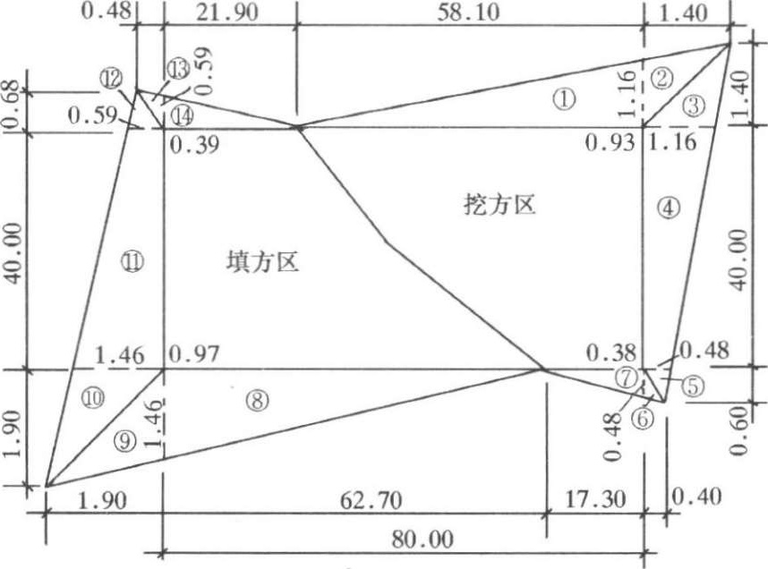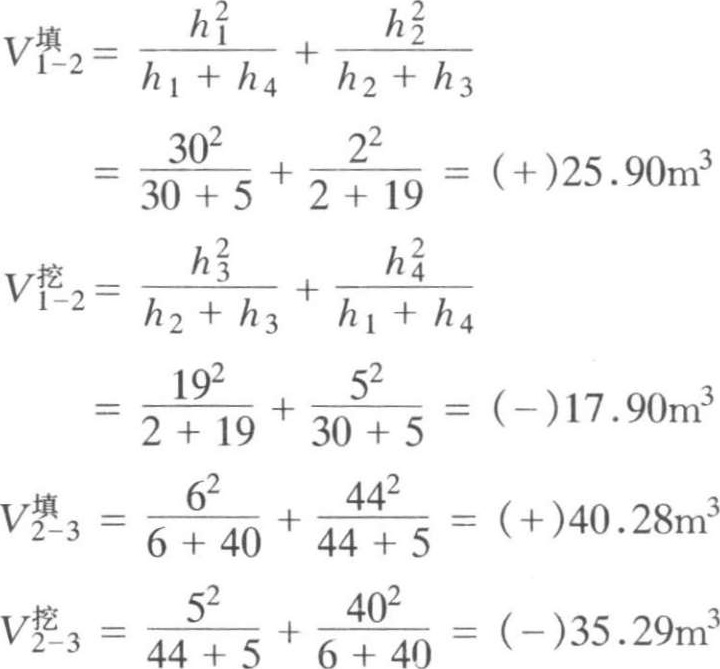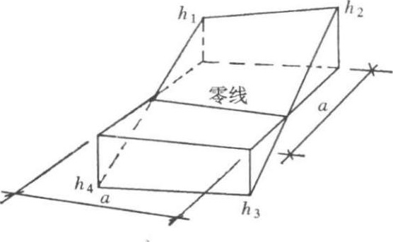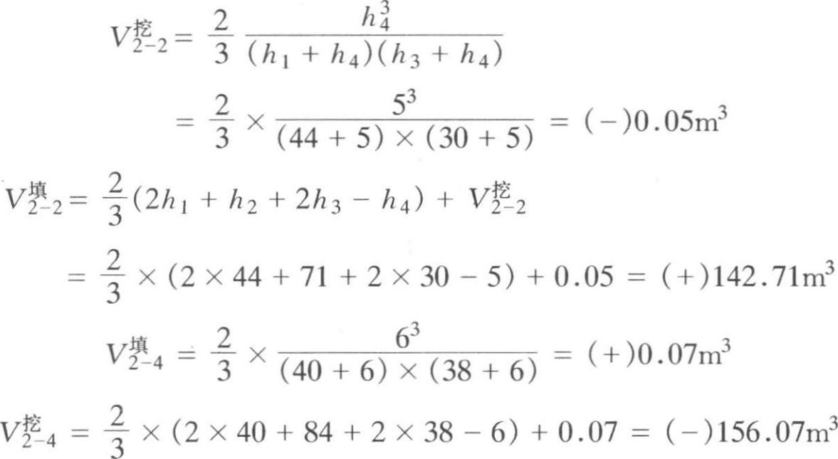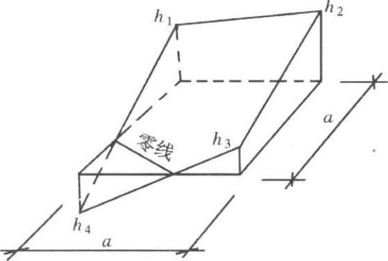 (2)方格的相邻两角点为挖方,另两角点为填方(图 2-2-9),其挖方部分的土方量为:
