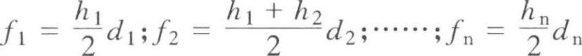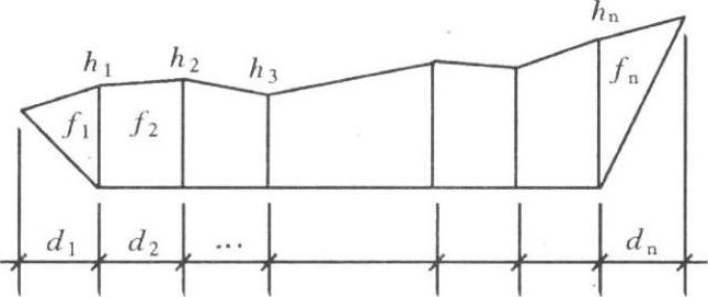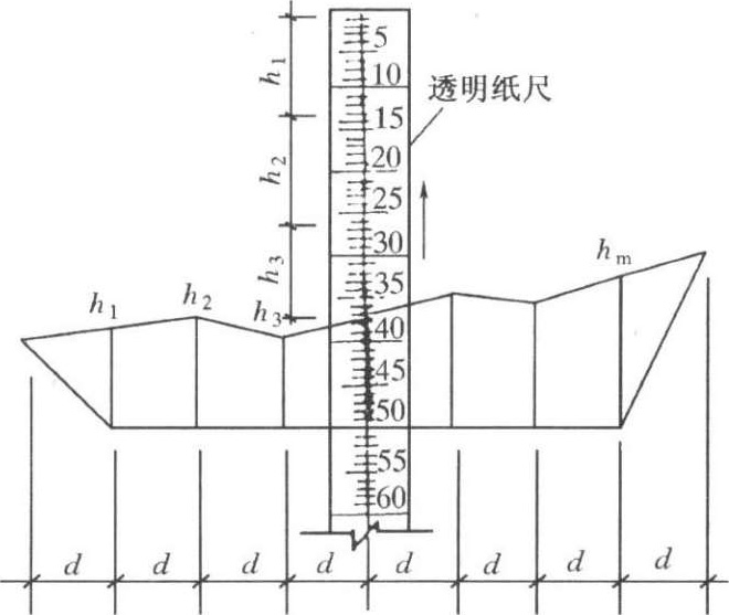 如图 1-2-12 所示,是用断面法求面积的一种简便方法,叫“累高法”。此法不需用公式计算,只要将所取的断面绘于普通坐标纸上( d 取等值),用透明纸尺从 h 1 开始,依次量出(用大头针向上拨动透明纸尺)各点标高( h 1 、 h 2 ……),累计得出各点标高之和,然后将此值与 d 相乘,即可得出所求断面面积。