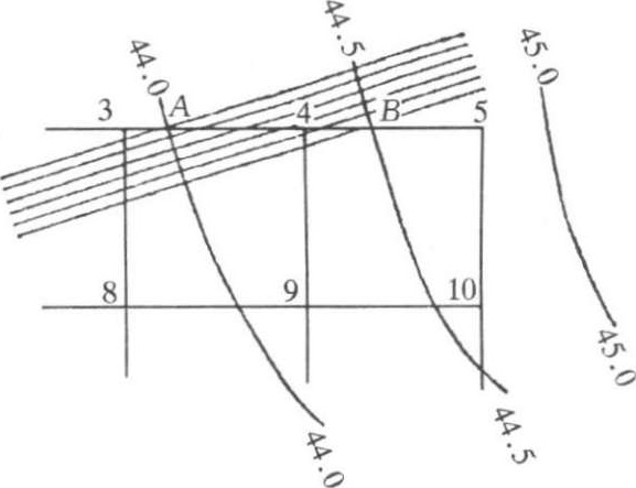 在地形图上,只要量出 x (角点4至44.0 等高线的水平距离)和 l (44.0 等高线和44.5等高线与 AB 直线相交的水平距离)的长度,便可算出 H 4 的数值。但是,这种计算是繁琐的,所以,通常是采用图解法来求得各角点的自然地面标高。如图1-2-6所示,用一张透明纸,上面画出六根等距离的平行线(线条尽量画细些,以免影响读数的准确),把该透明纸放到标有方格网的地形图上,将六根平行线的最外两根分别对准点 A 与点 B ,这时六根等距离的平行线将 A 、 B 之间的0.5m的高差分成五等分,于是便可直接读得角点4的地面标高 H 4 =44.34。其余各角点的标高均可类此求出。