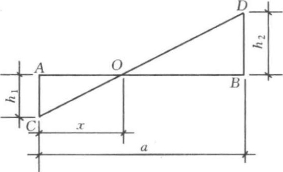 确定零点的简便方法是图解法。如图 1-2-13所示,用与方格网相应的比例画出直线 AB ,令其等于方格边长 a ,通过 A 、 B ,用另一较大的比例分别绘出 h 1 和 h 2 ( h 1 为填方角点的施工高度, h 2 为挖方角点的施工高度),连接 C 、 D ,其直线交 AB 于 O , O 即为零点。各有关方格边线上的零点图解,如图1-2-14所示。