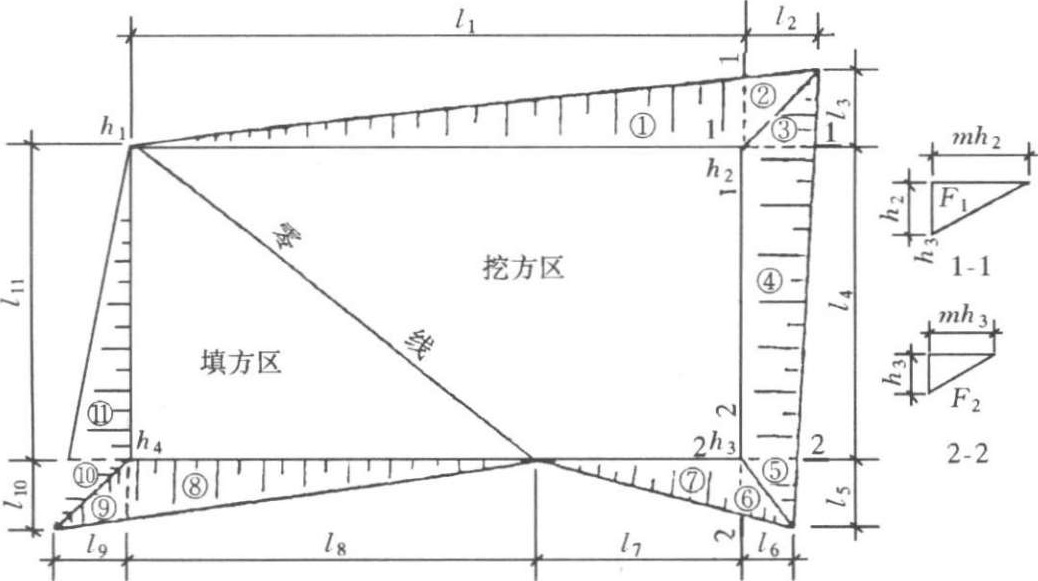 沿场地的纵向或相应方向取若干个相互平行的断面(可利用地形图定出或实地测量定出),将所取的每个断面(包括边坡)划分成若干个三角形和梯形,如图1-2-11所示。对于某一断面,其中三角形和梯形的面积为: