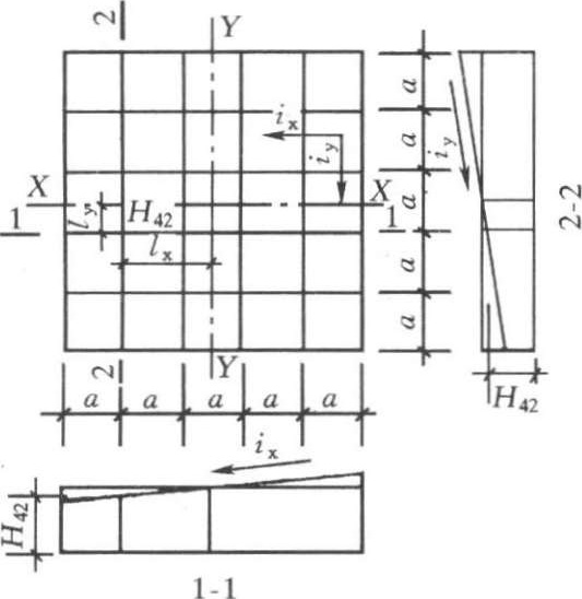 如果按照式(1-2-2)计算出的设计标高进行场地平整,那么,整个场地表面将处于同一个水平面,但实际上由于泄水要求,场地表面都需作成一定的泄水坡度。因此,还需按照场地泄水坡度的要求(单向泄水或双向泄水),计算出场地内各方格角点设计标高的实际施工值。