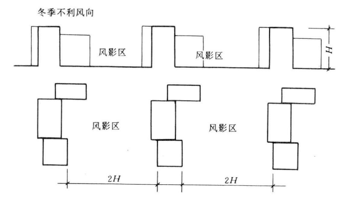 1.建筑物紧凑布局,使建筑间距在1 ∶ 2的范围以内,可以充分发挥风影效果,使后排建筑避开寒风侵袭,见图2-5-1。
