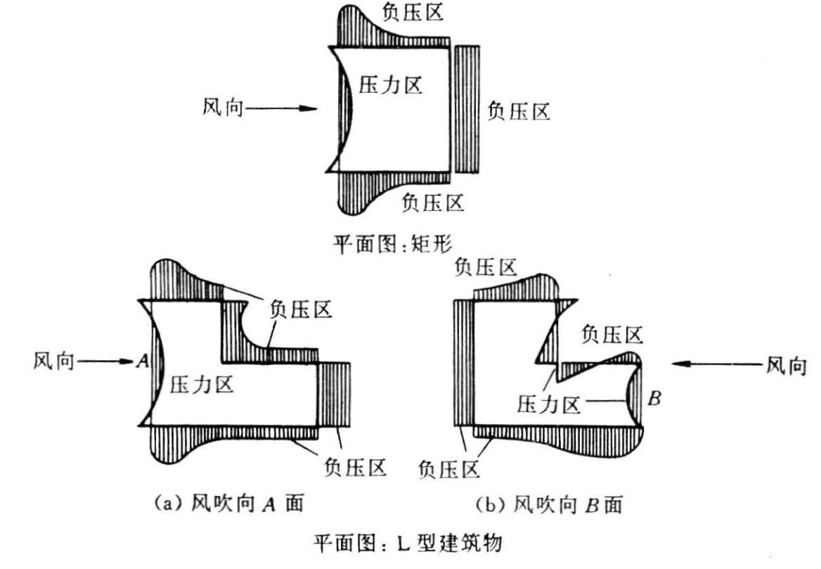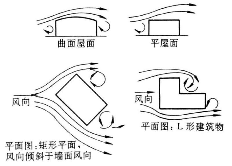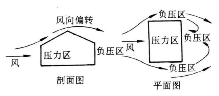 当风垂直吹向建筑物正面时,受到建筑物表面的阻挡而在迎风面上产生正压区。气流在向上偏转同时,绕过建筑物各侧面,而在这些面上造成负压区,如图2-5-6、2-5-7、2-5-8、2-5-9。