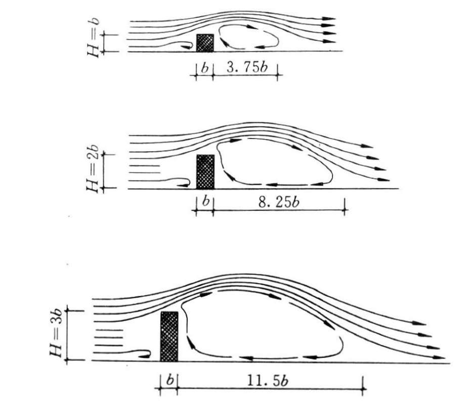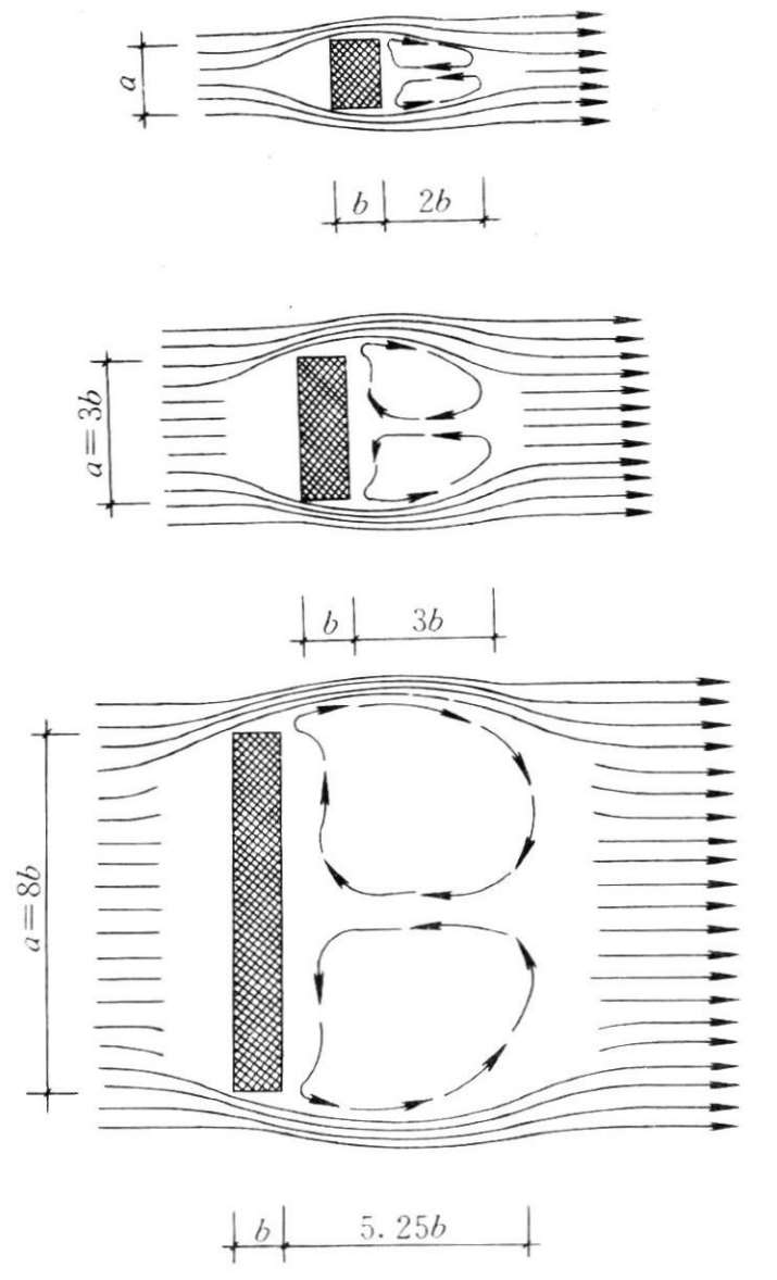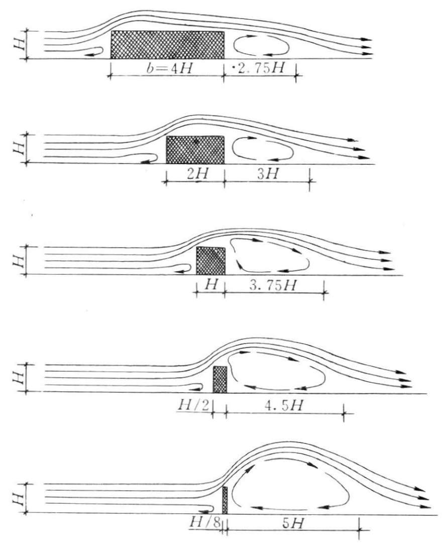 单体建筑物的三维尺寸对其周围的风环境带来较大的影响。从节能的角度考虑,应创造有利的建筑形态,减少风流、减少风压、减少耗能热损失。建筑物越长、越高,进深越小,其背风面产生的涡流区越大,流场越紊乱,对减少风速、风压有利,如图2-5-12、2-5-13、2-5-14。