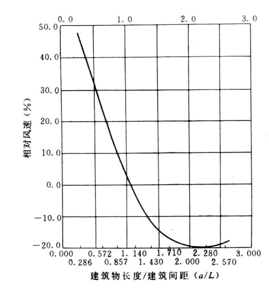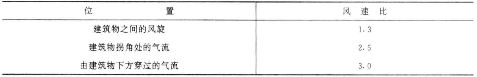 1.当低层与高层建筑如图2-5-10布局时,在冬季季风的入侵时,会形成比较大的湍流,称为风旋,使风速加大,进而增大风压,造成热能损失大。对此,有人进行过研究,研究结果为:设高层建筑物前方有低层建筑物,则在行人高度处的风速与在开敞地面上同一高度处自由风速之比值见表2-5-2。其风旋风速扩大1.3倍,建筑物拐角处气流风速扩大2.5倍。