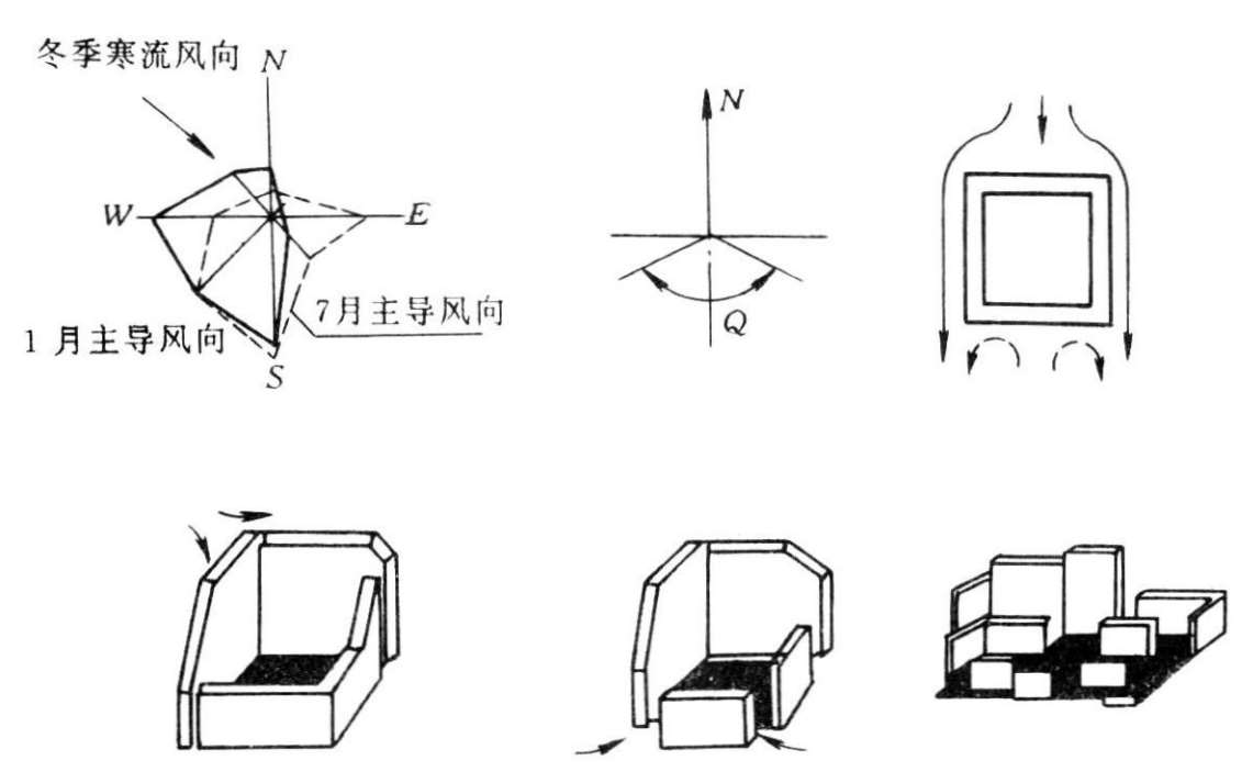 我国北方城市冬季寒流主要受来自西伯利亚冷空气的影响,所以冬季寒流风向主要是西北风。而各地区最冷月(即一月份)的主导风向也是不利的风向(表2-5-1)。故建筑规划中为了节能,应封闭西北向,合理选择封闭或半封闭周边式布局的开口方向和位置,使得建筑群的组合避风节能。见图2-5-4。