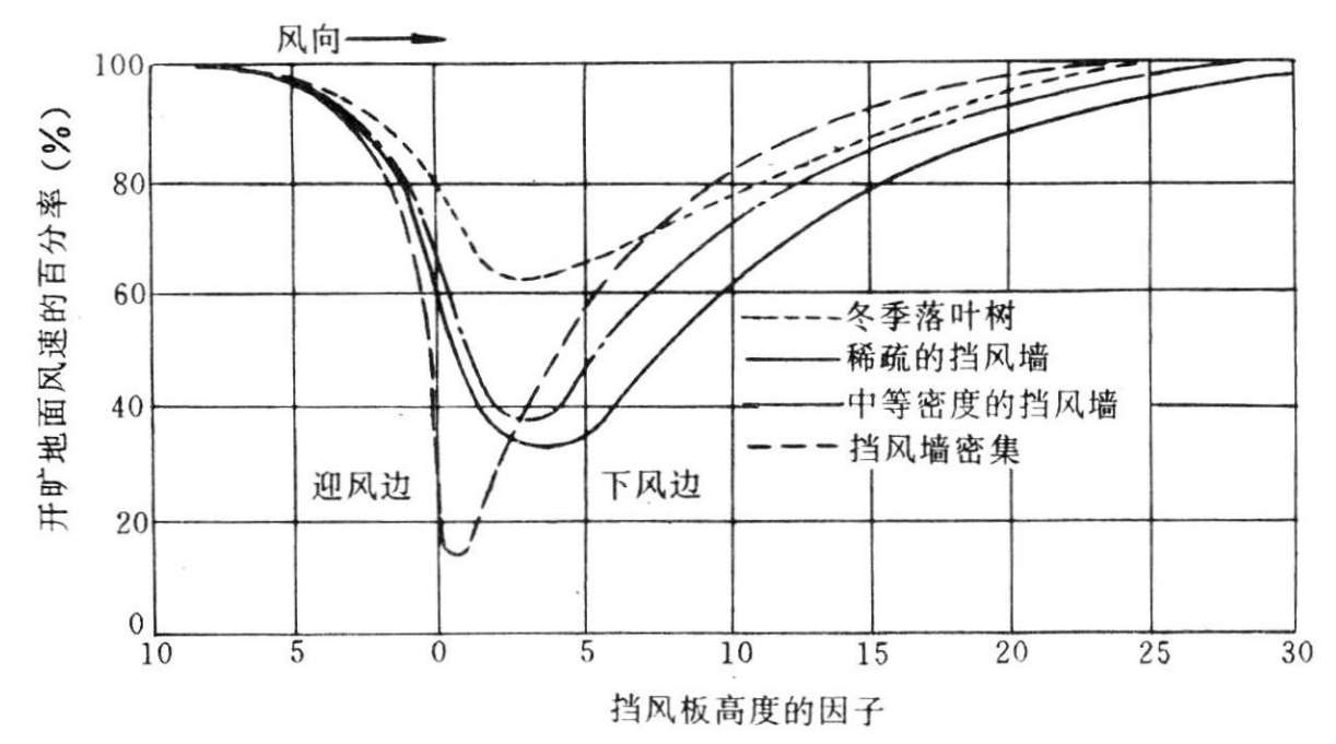 设置防风墙、板,防风林带之类的挡风设施很有效果。防风墙的高度、密度与距离均影响其挡风效果,如图2-5-2。