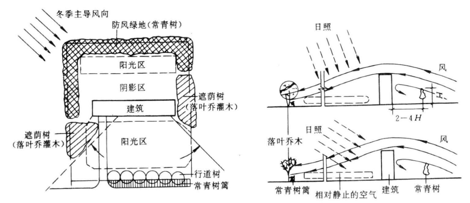 通过适当布置建筑物,降低冷天风速,可减少建筑物和场地外表面的热损失,节约热能。