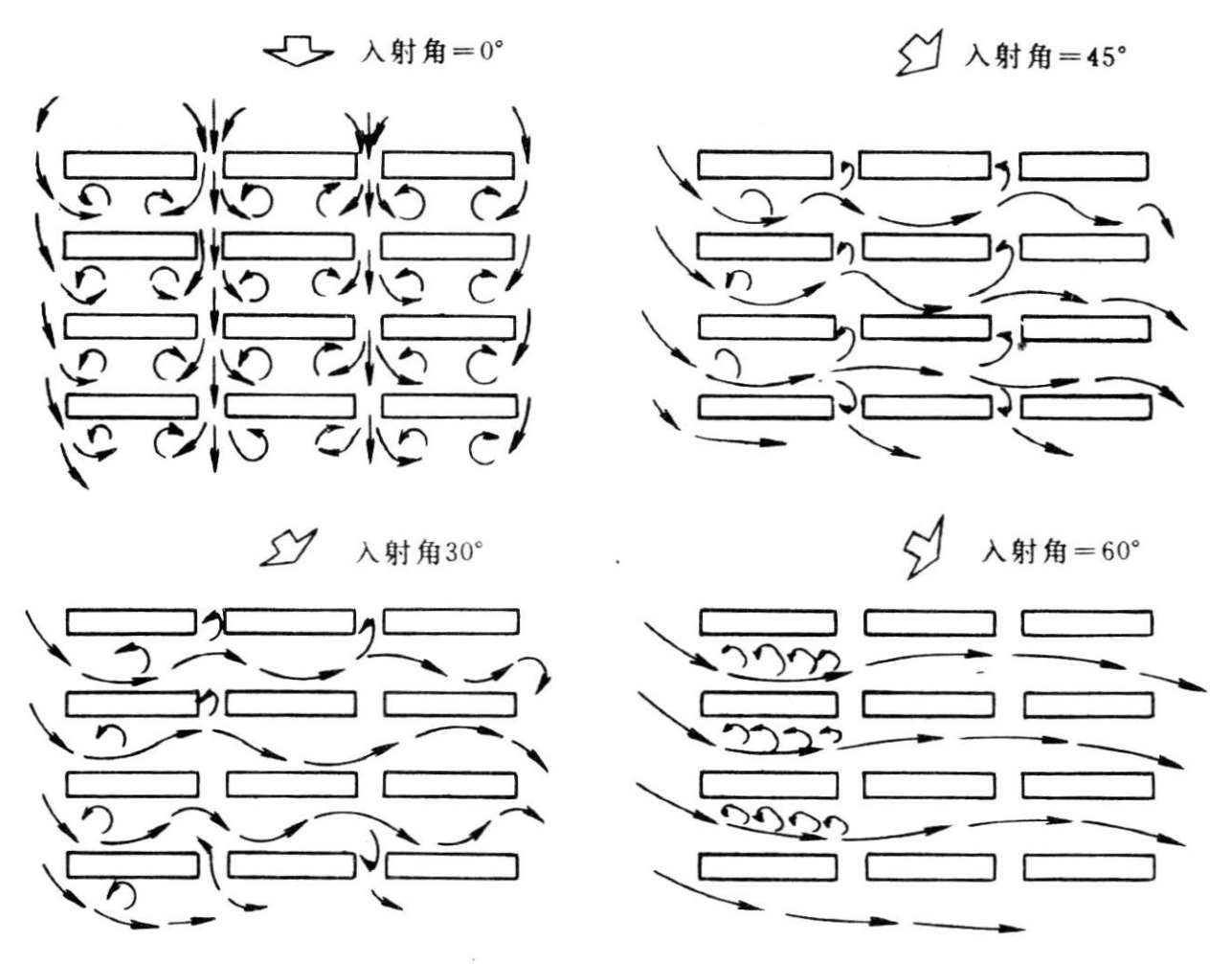 从避免冬季季风对建筑的侵入来考虑,应减少风向与建筑物长边的入射角度,如图2-5-15。风向相同间距不同时迎风面风速百分率的比较见图2-5-16。