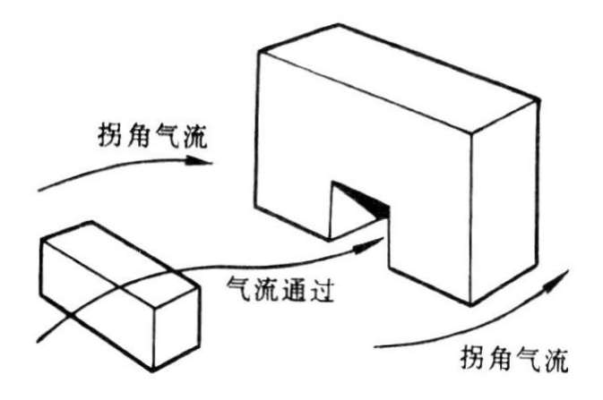 2.当建筑在规划设计时,为了满足防火通道要求,以及解决人流疏散要求需要设计过街门洞时,由过街门洞穿过的冬季季风气流,引起局部风速加大,称为风洞效应(图2-5-11)。由建筑物下方门洞穿过的气流使自由风速扩大3倍。