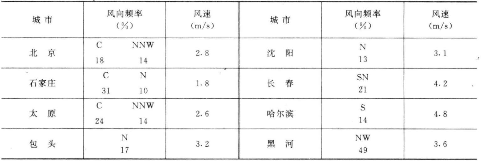 我国寒地主要城市一月最多风向频率及冬季平均风速 表2-5-1
