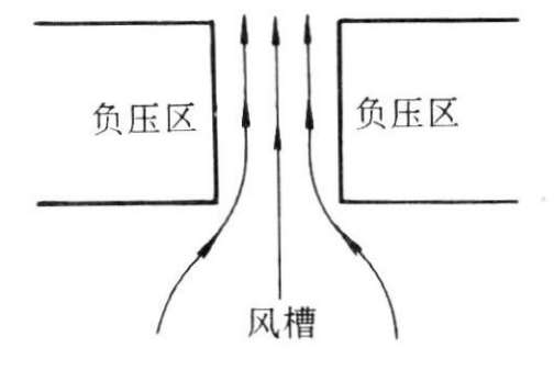 如前所述,风压和风速的平方成正比,故风速增大就会大大提高负压。上述文摘中还阐明了两幢建筑物之间的风槽如何造成了风速的增大,从而又提高了风槽两边建筑物相对二墙面上的负压,如图2-5-9。
