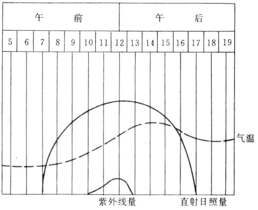 在一天的时间里,太阳光线中的成分是随着太阳高度角的变化而变化的。其中紫外线量与太阳高度角成正比(表2-6-1)。正午前后紫外线最多,日出后及日没前最少(图2-6-2)。实际证明,冬季以南向、东南和西南居室内接受紫外线较多,而东、西向较少,大约为南向的一半,东北、西北和北向居室最少,约为南向的1/3左右。因此,选择朝向对居室所获得的紫外线量是应予以重视的,它是评价一个居室卫生条件的必要因素。