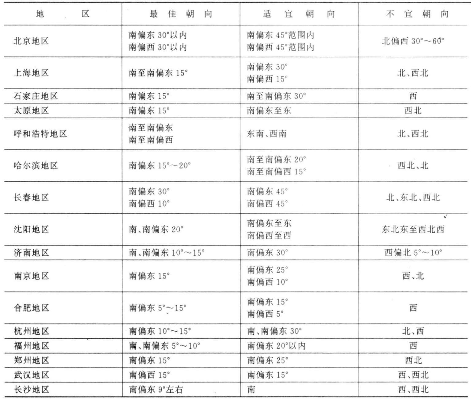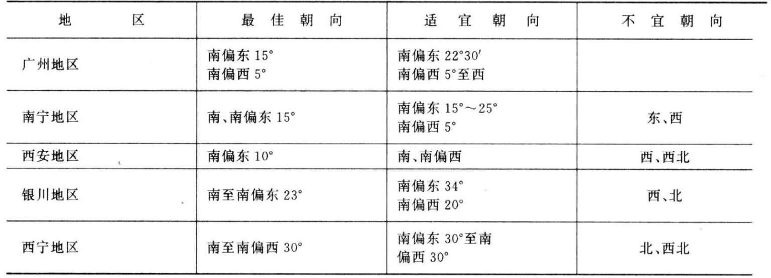 根据上述所应考虑的四个方面,各地区对当地的日照和风向条件进行过实测和分析,并总结出了当地住宅的最佳朝向和适宜朝向的建议(表2-6-2),供城市规划和居住建筑群体布置时作为朝向选择的参考。