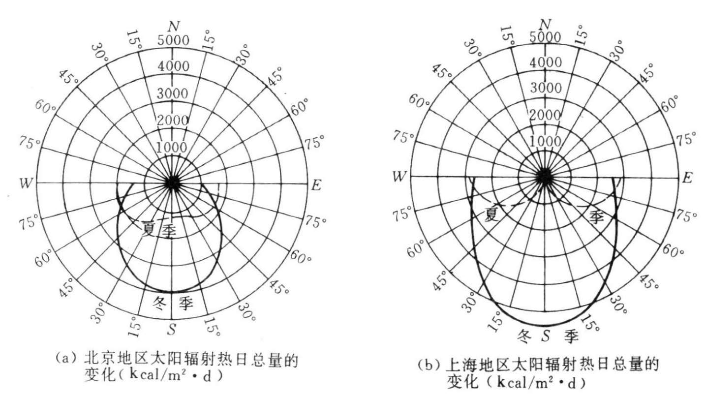 太阳辐射包括直射和散射,此处只考虑太阳直射影响〔以单位时间在单位面积上的辐射值表示:cal/(cm 2 ·d)〕。一般包括两个方面:一是最冷月和最热月的太阳累计辐射强度;一是太阳直射强度日变化曲线与日气温曲线的关系。例如:由北京地区的太阳辐射量图(图2-6-1)可以知道,冬季各朝向墙面上接受的太阳直射辐射热量以南向为最高〔3948kcal/(m 2 ·d)〕,东南和西南次之,东、西则更少,分别为1011kcal/(m 2 ·d)和1309kcal/(m 2 ·d)。而在北偏东或西30°朝向的范围内,冬季接受不到太阳的直射辐射热。夏季以东、西为最多,分别为1716kcal/(m 2 ·d)和2109kcal/(m 2 ·d),南向次之为1192kcal/(m 2 ·d),北向最少为724kcal/(m 2 ·d)。由于太阳直辐射强度一般是上午低、下午高,所以无论是冬季或夏季,墙面上接受的太阳辐射量,都是偏西比偏东的朝向稍高一些。