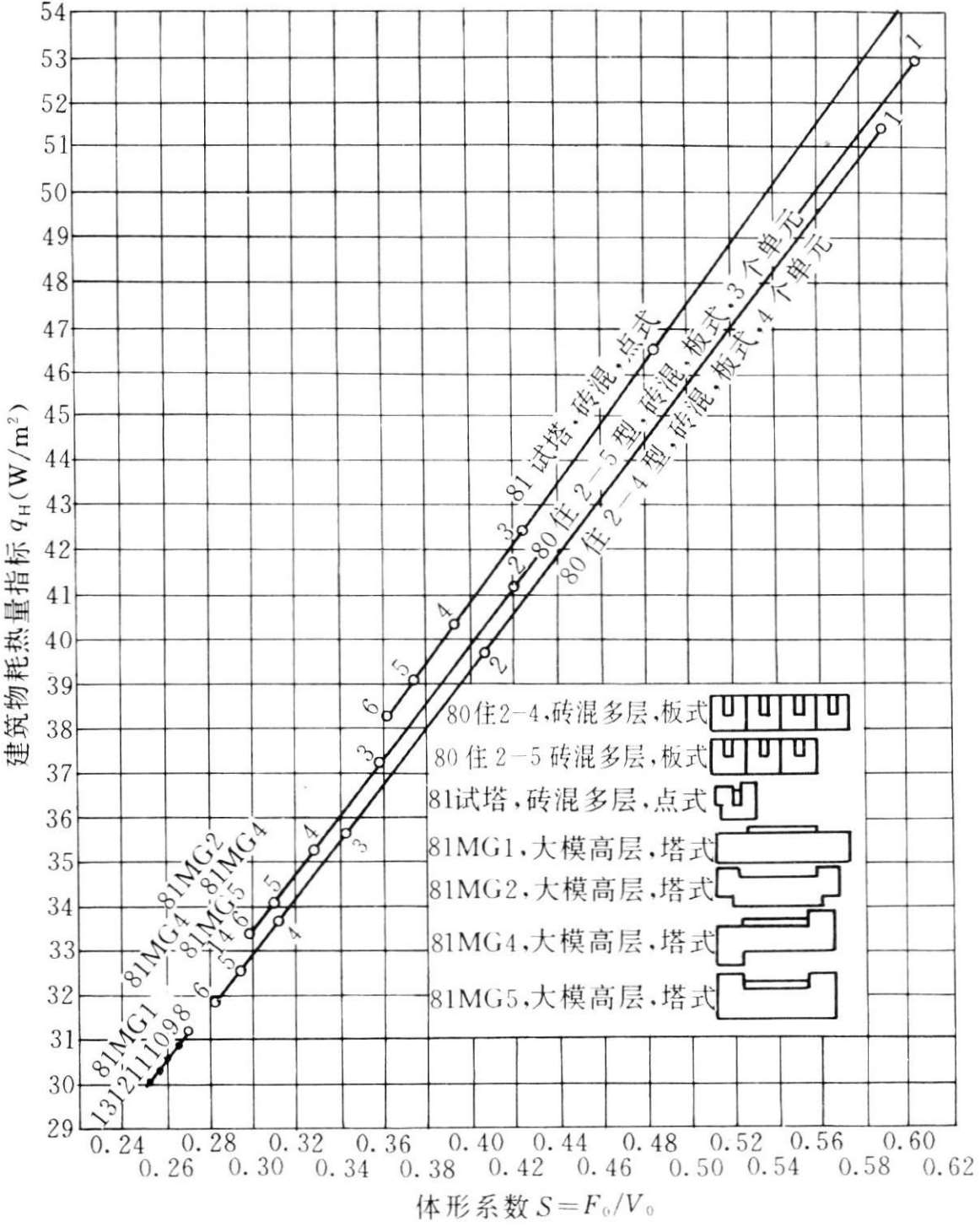 1.体形系数。在建筑物各部分围护结构传热系数和窗墙面积比不变条件下,热量指标随体形系数成直线上升。(见图3-3-1)。低层和少单元住宅对节能不利。
