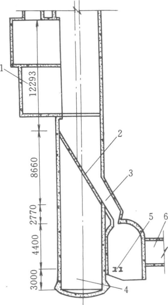 1—通过式箕斗装载硐室;2—斜式井筒接受仓钢筋混凝土板;3—斜式井筒接受仓;4—水窝;5—装载点;6—泵房