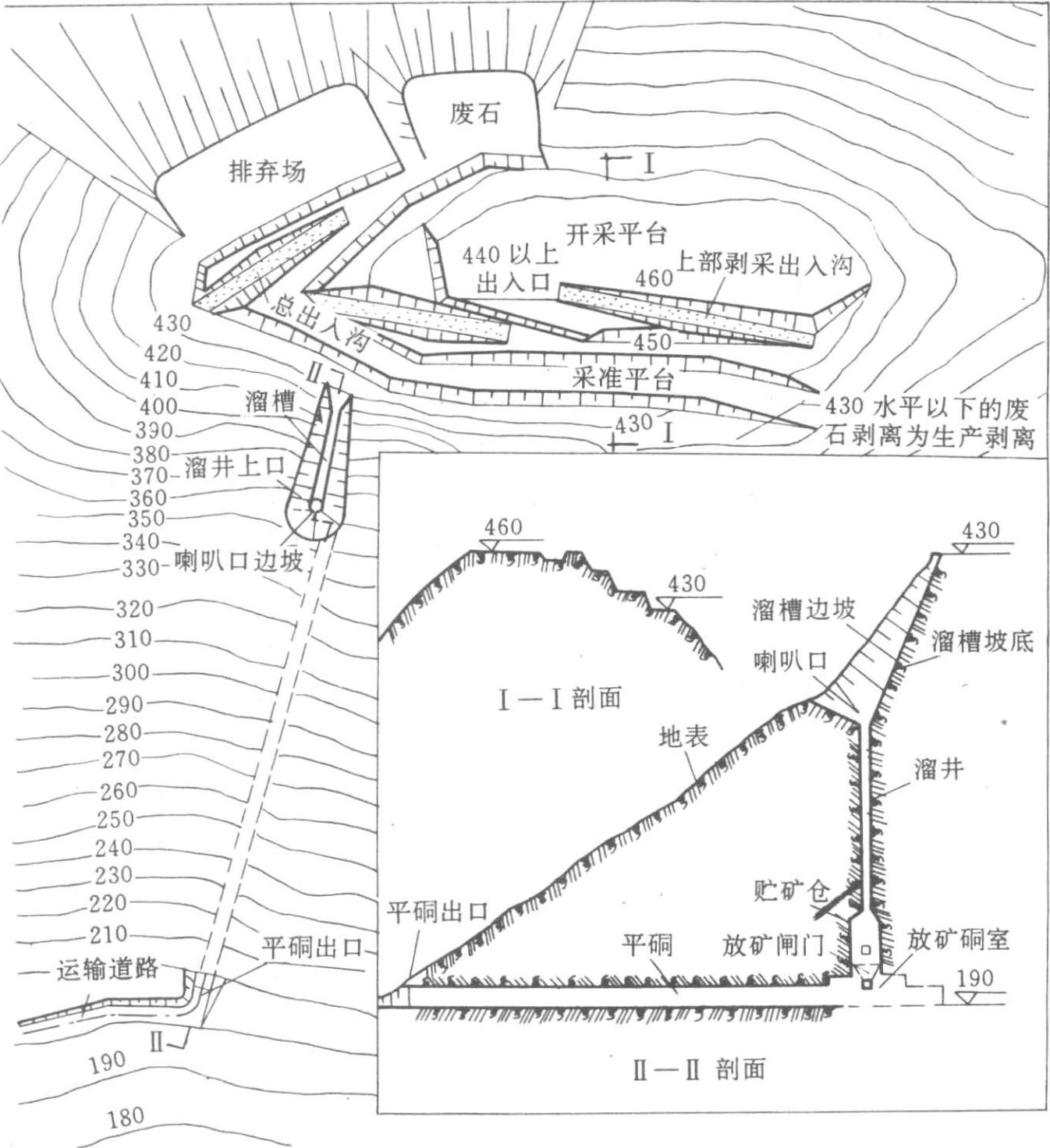 2.山坡露天矿山各开采水平的出入沟和连通各阶段的总出入沟,除了少数地段为双壁路堑外,大部分为单壁路堑。运输为重载下坡,空载上坡,动力消耗低。剥离废右可沿多水平排弃。