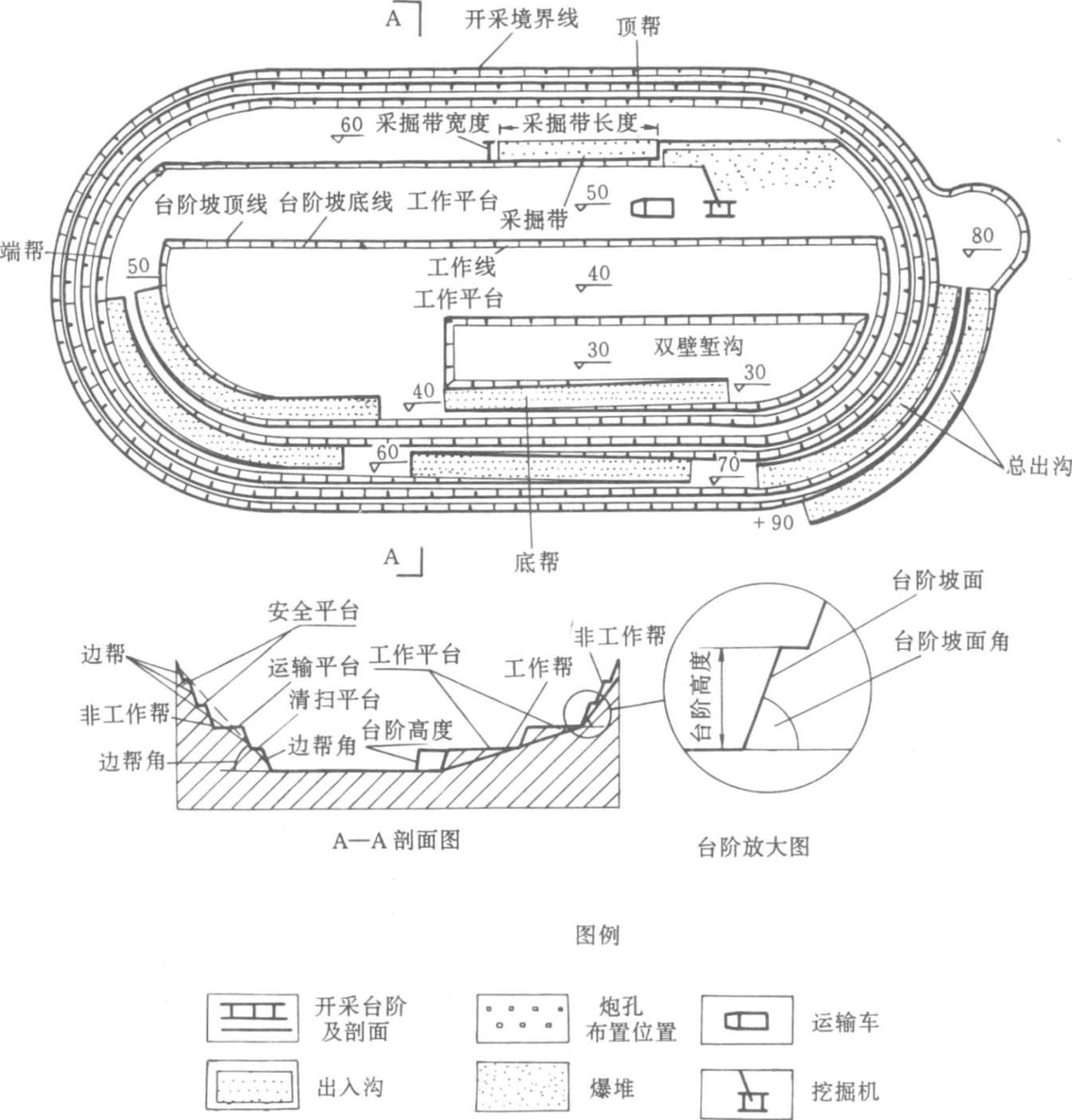 2.台阶。为适应采掘及运输设备的安全正常作业,将覆盖层、围岩及矿体划分成一定高度的分层,称为台阶(或称为阶段或水平)。