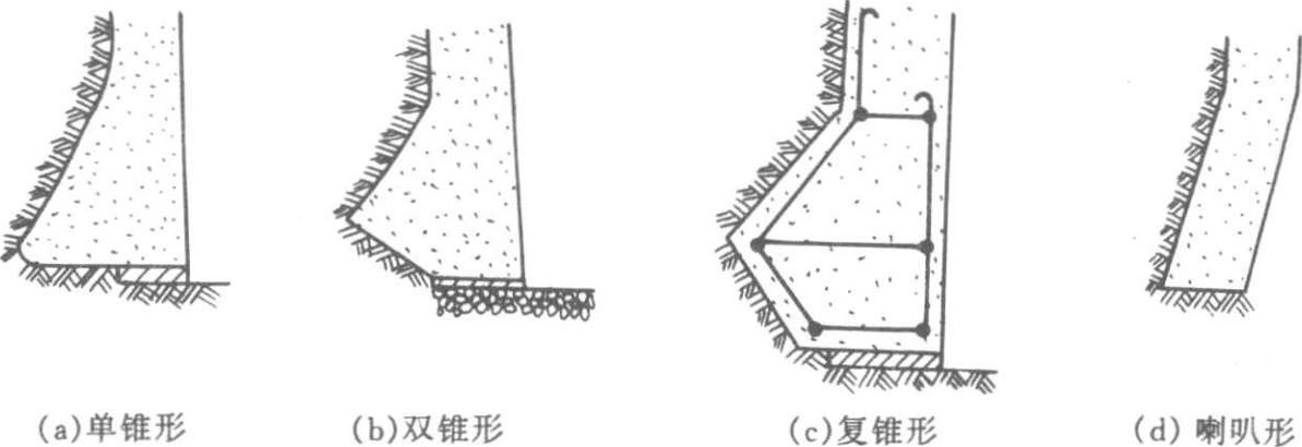 壁座(也称壁基、基座),是支撑上部永久井壁与悬吊下部临时支护用的。壁座的种类很多,形状和规格主要是依据围岩的物理机械性质决定的,有单锥形、双锥形、复锥形、混合形、喇叭形等,见图 1.4.6。