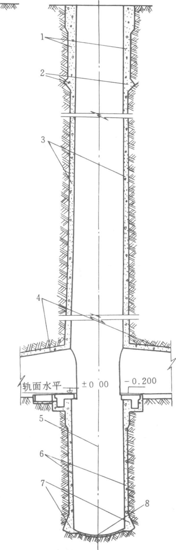 1—井颈混凝土壁;2—混凝土壁座;3—井筒身混凝土壁;4—马头门混凝土拱碹;5—井底水窝;6—井底水窝混凝土壁;7—水窝壁座;8—水窝混凝土弧形底