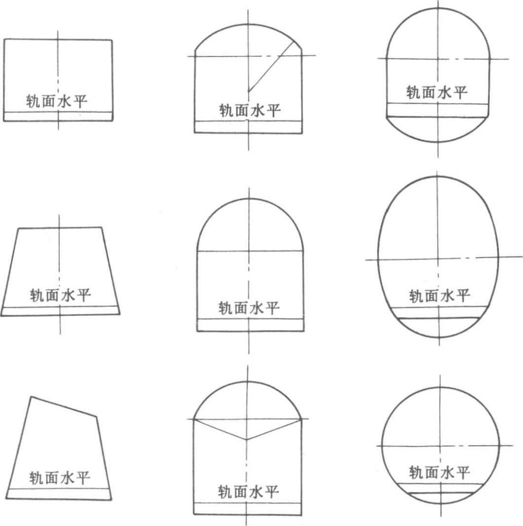 (2)巷道断面形状。倾角大于5°的巷道为斜巷,小于5°的巷道为平巷。斜井和斜巷,平硐和平巷的断面形状是一样的。其形状按构成轮廓有矩形、梯形、不规则形、三心拱形、半圆拱形、弧形、马蹄形、椭圆形、圆形等,见图 1.4.3。