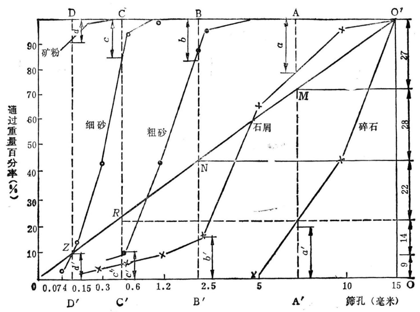 (4)在碎石和相邻石屑的二个级配曲线之间找出a = a'处,并引与垂直于横轴的直线A -A'。AA'与对角线OO'交点为M,其与上轴之间的纵座标距离M - A即为碎石的用量比例。同样,在石屑和粗砂级配曲线之间找出b = b'并引B - B'线,与对角线交点为N。M和N之间的纵座标距离即为石屑的用量比例。随后再找出c = c'+ c",引C -C'线,与对角线交于R,R和N之间的纵座标距离即为粗砂的用量比例。找出d = d'引D - D'线,与对角线相交于Z,Z和R之间的纵座标距离即为细砂的用量比例,而Z与下轴之间的纵座标距离即为矿料的用量比例。