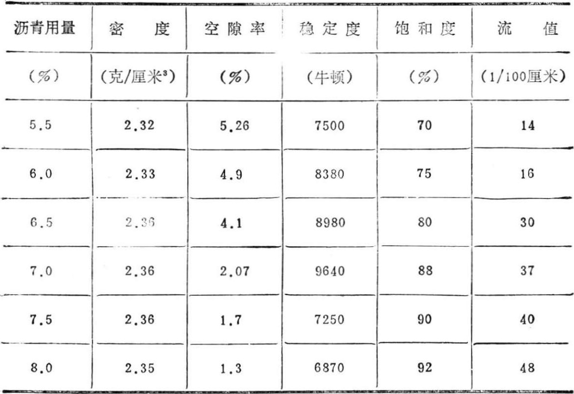 4.测定试件的密度、稳定度和流值,并计算空隙率及沥青饱和度(取四个试件的平均值),试验和计算结果见附表6.4。