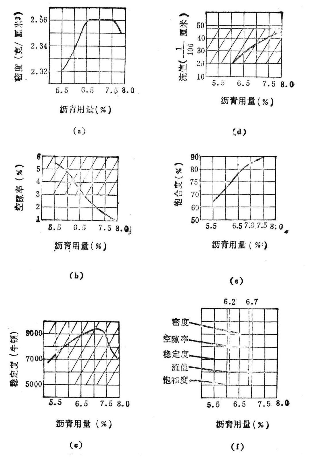 7.求出满足所有标准值的沥青用量范围,即为共同范围见附图6.3(f),此范围为6.2-6.7 %,若采用中间值作为设计沥青用量,即为6.45 %。