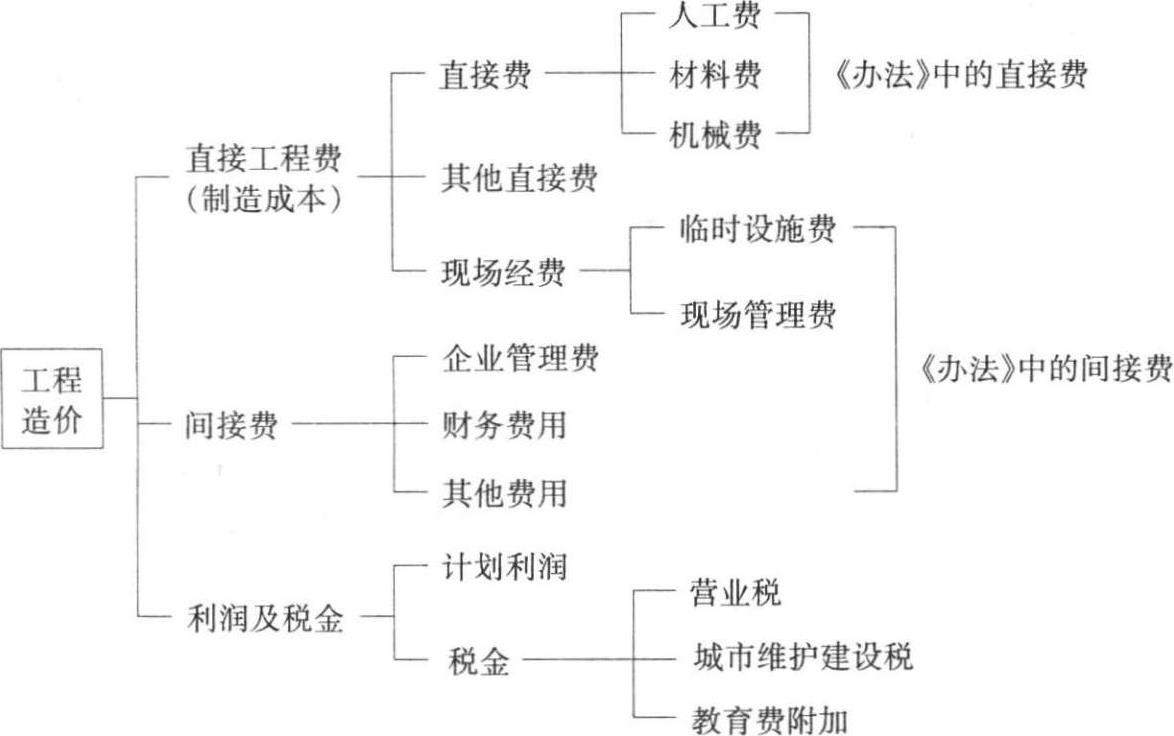 我国现行建设工程施工发包承包价格是根据上述理论进行构思的,也符合我国改革后的财会制度的指导思想和发展趋势。建设部在建标[1993]894 号《关于调整建筑安装工程费用项目组成的若干规定》中对工程施工发包承包价格的费用项目构成作了如图3-1的规定,即工程造价由直接工程费、间接费、计划利润和税金构成,其中,直接工程费即等于项目的制造成本。《办法》的第五条中规定:“分部分项工程量的单价为直接费。直接费以人工、材料、机械的消耗量及其相应价格确定。间接费、利润、税金按照有关规定计算”。可见,894 号文中的“直接费”就是《办法》中的“直接费”;《办法》中的“间接费”则包括了 894 号文中的“其他直接费”、“现场经费”和“间接费”。