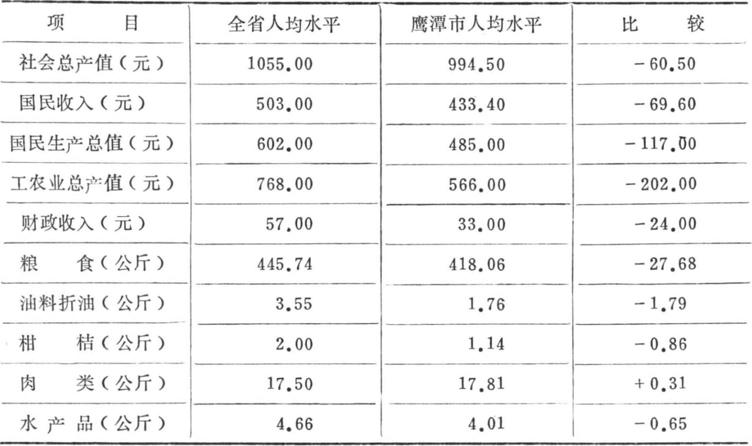 鹰潭市域的开发有悠久的历史。解放后,发展很快。尤其是1983年7月设省辖市后,经济建设和各项社会事业都取得了显著进步。全市农业生产稳步发展,粮食商品率达40%以上,贵溪、余江两县是省商品粮生产基地、优质稻生产基地、瘦肉猪生产基地、黄(红)麻生产基地和速生丰产林的生产基地之一。工业上,现代化铜冶炼厂的建成,成为市域内工业的精华和核心,对全市国民经济的发展,起着巨大的推动作用。1987年,全市工业总产值达9.11亿元,较1983年增长2倍多;1983-1987年全市工业生产年平均递增速度高达32.5%,工业增长速度居江西省之首。同时,交通运输的建设步伐加快,使本市已初具对内对外双向开放和全面开发的经济建设物质基础,并作为我国东南部沿铁路干线重点发展的中心城市和江西省新兴的、大有发展潜力的地区经济中心而崛起(见表1-5、1-6)。