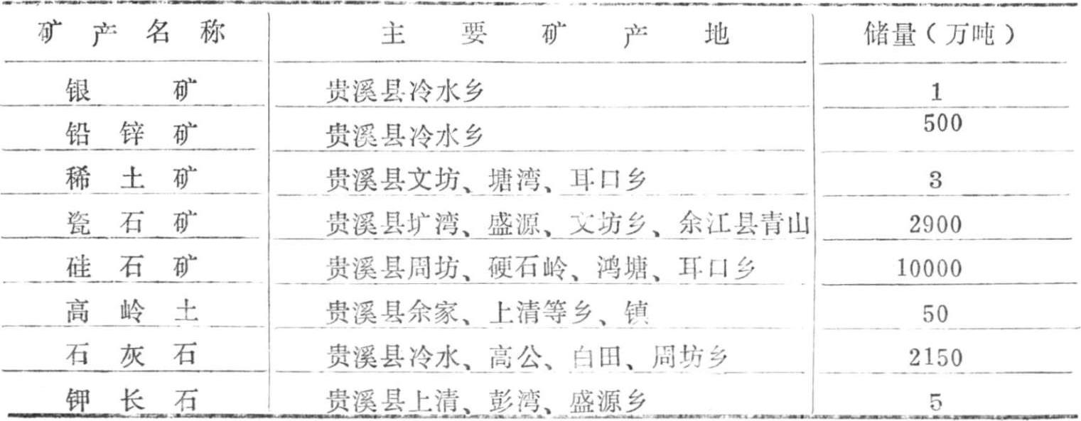 本市矿产资源总的特征是:金属、非金属矿产分布面广,主要矿种储量大,而且多为伴生共生矿。已发现矿种30多种,产地44处。金属矿有银、铅、锌、金、镉、铁等;非金属矿有硅石、瓷土、药用粘土、膨润土、型砂、钾长石、石墨、红柱石、石灰石、花岗石、橄榄辉绿岩、珍珠岩等。此外,还有铀矿、稀土矿和宝石矿等。市境内有大型矿床4处,主要矿产银、铅、锌等储量规模可名列江西省或全国前茅(见表1-4)。
